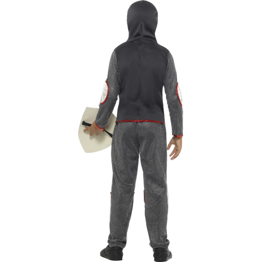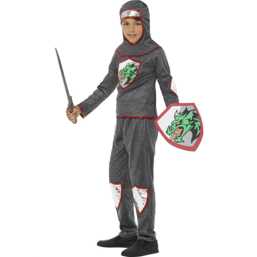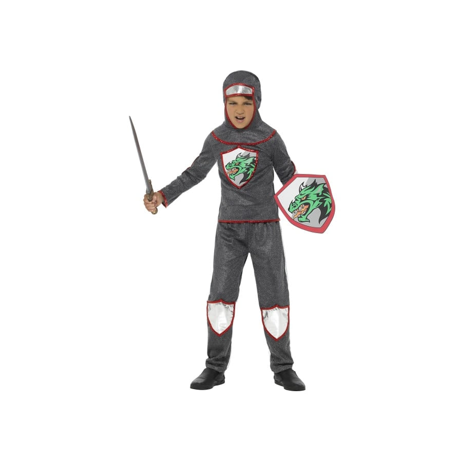 Un vaillant petit chevalier s'apprête à partir au combat. Pour vaincre les dragons et autres créatures mystérieuses, il va falloir revêtir une super armure ! La tenue de chevalier pour enfant, cotte de maille est le déguisement idéal pour faire face au danger. Cet article est composé d'un haut à manches longues en cotte de maille, de couleur grise, avec un motif dragon imprimé sur le torse. Il est doté d'une capuche de la même couleur. Le pantalon est également assorti au reste. La cotte de maille confère une certaine souplesse au costume. Pour couronner le tout, un bouclier avec motif dragon est fourni. Il saura protéger le vaillant chevalier contre tous ses ennemis !