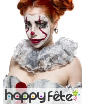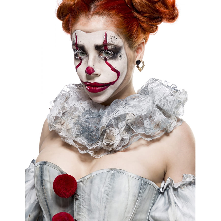 Mais attendez, ce n'est pas fini! Les manchettes, elles aussi bouffantes, épousent les motifs de la jupe. La dentelle blanche brodée leur confère un air presque innocent... si l'on oublie le thème général du costume, bien sûr. Et pour finir en beauté, ce col en dentelle blanche et grise qui entoure délicatement votre cou. Un élément qui rappelle les tenues des clowns d'antan, avec une touche moderne et élégante.