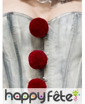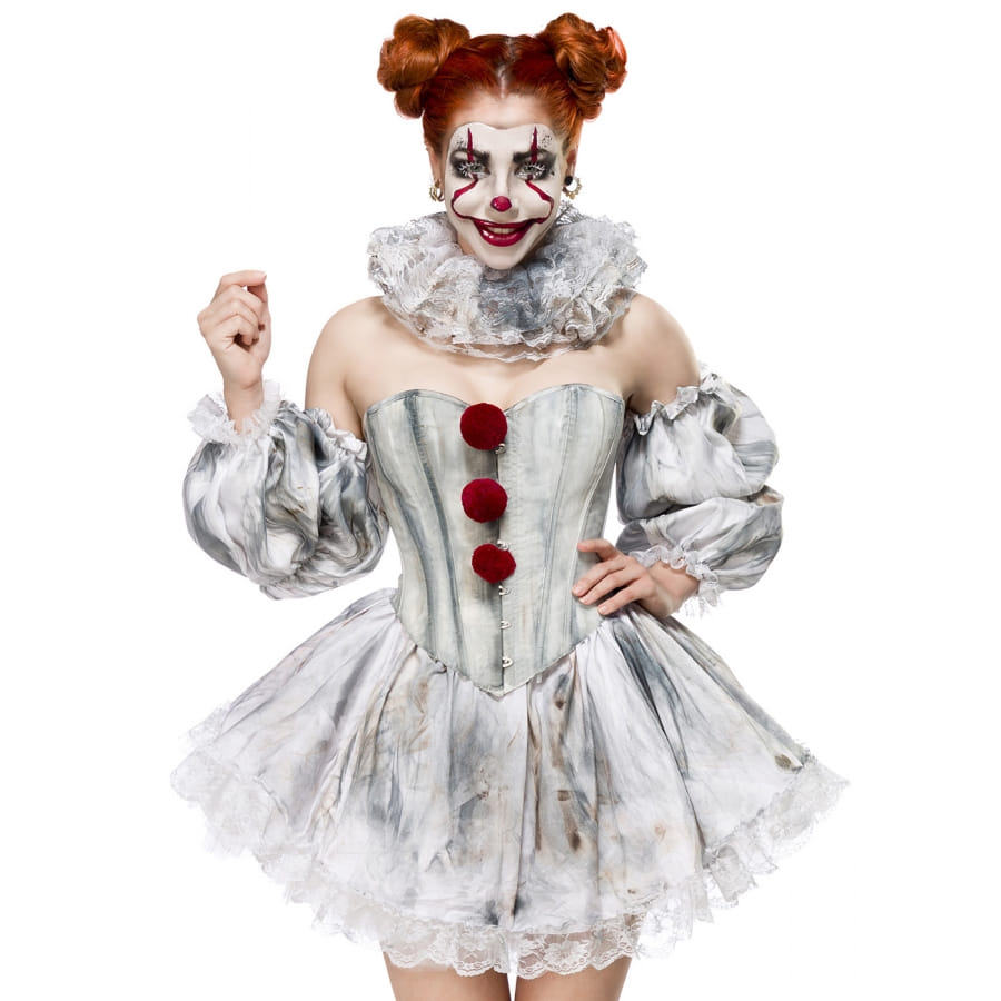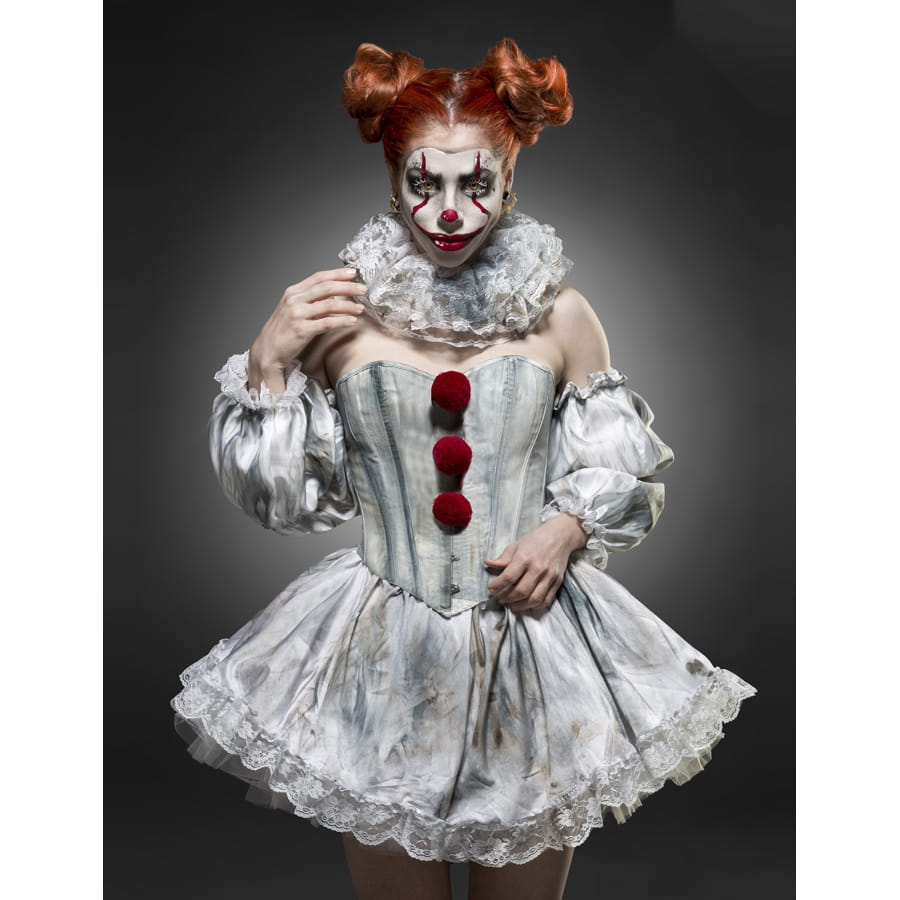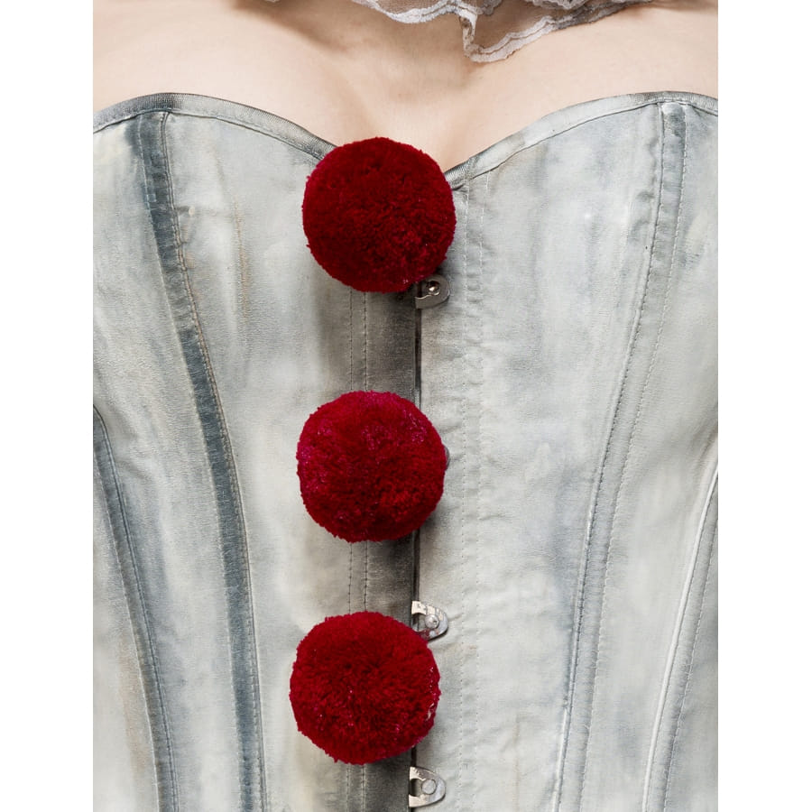 Commençons par le corset. En tons de gris et blanc, il est finement conçu pour mettre en valeur chaque courbe, chaque détail de votre silhouette. Les petits pompons rouges ajoutent une touche espiègle, rappelant l'esprit joueur d'un clown, tout en conservant ce côté terrifiant. Son laçage à l'arrière et sa fermeture à crochets à l'avant assurent un ajustement parfait, peu importe la danse macabre que vous envisagez.