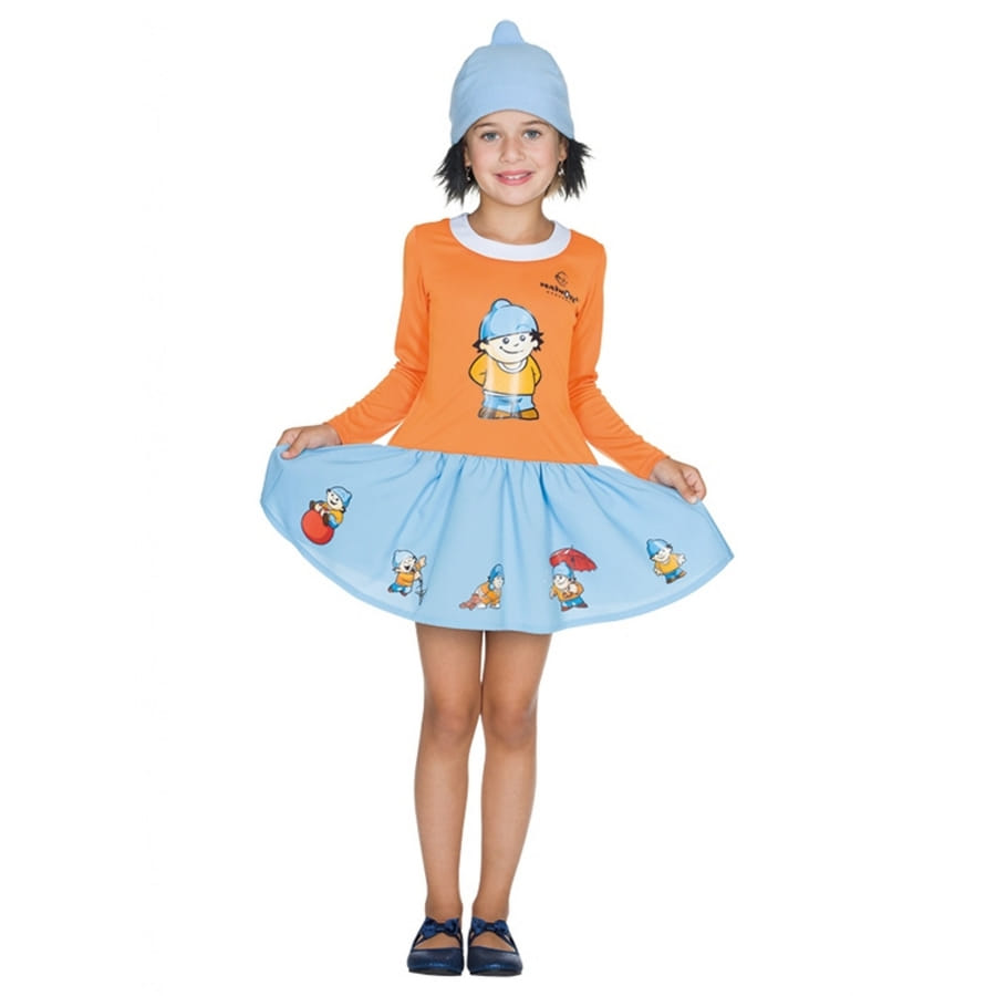 La robe avec jupe fluide assortie au bonnet. Elle est floquée du personnage Conni dans diverses postures. Le haut est orange avec un col blanc et des longues manches. Conni y est également floqué sur le buste.