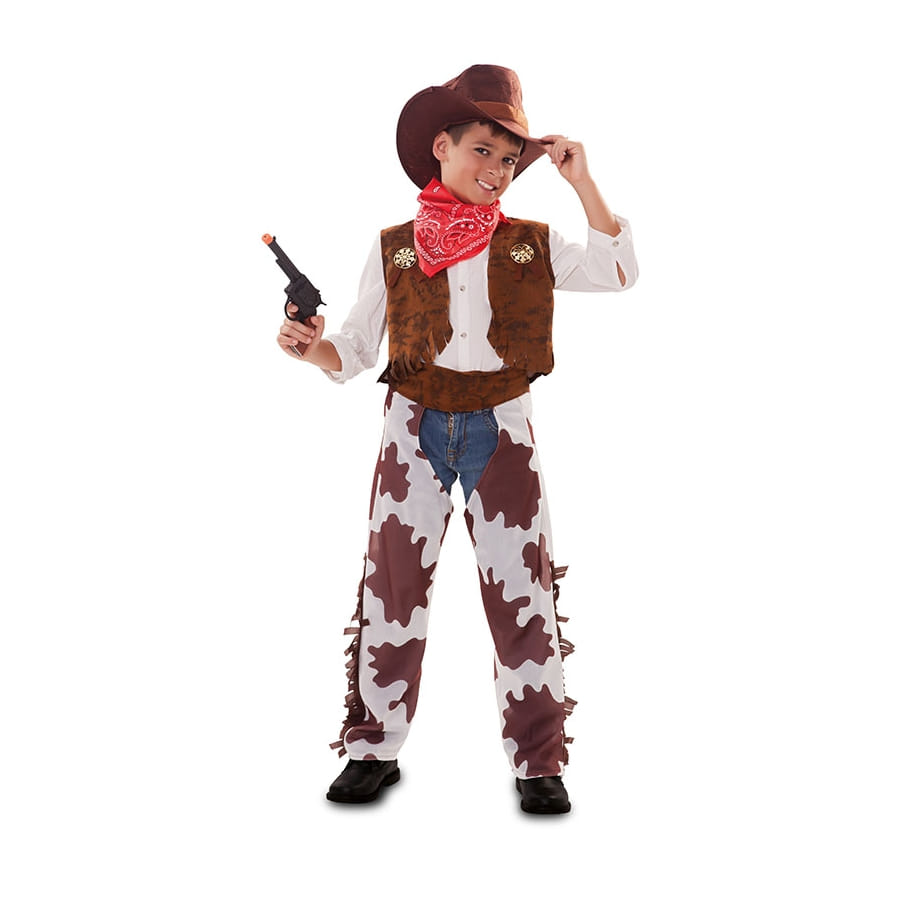 La tenue de cowboy chaps vachette pour enfant se compose d'un gilet, d'un bandana, d'un chapeau et d'une ceinture.
