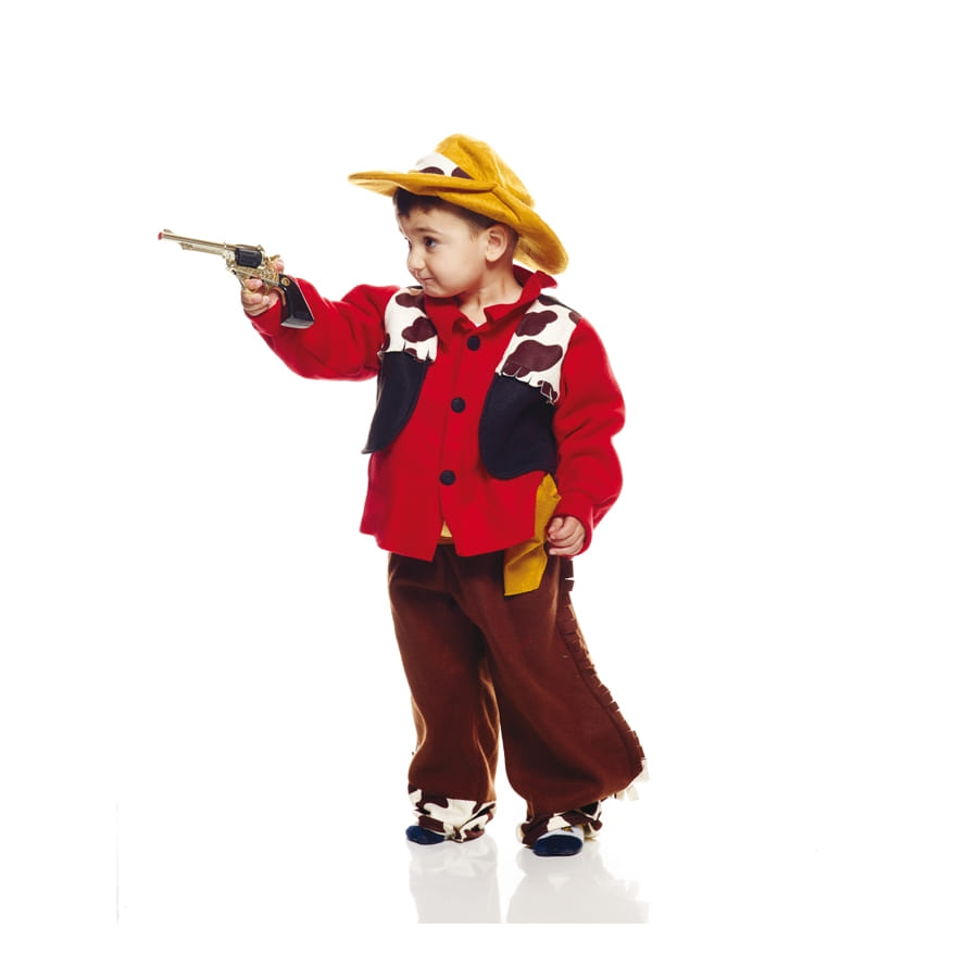 Si petit et déjà dans les rangs des cowboys, votre boutchou ne peut qu'être fier de son nouveau look. Comme maman et papa, lui aussi va se mettre au style western ! Pour vous faciliter la tâche, emparez-vous de cette tenue de cowboy pour tout petit qui habillera votre adorable garçon en cowboy du far west. La chemise est à manches longues, de couleur rouge. Le gilet s'enfile par dessus. Il évoque la peau d'une vache avec ses taches blanches et marron. Le pantalon est marron et la ceinture est équipée d'un holster. Quant au chapeau, il est de couleur jaune. A noter que l'ensemble est proposé pour les 1 an, 2 ans et 3 ans.