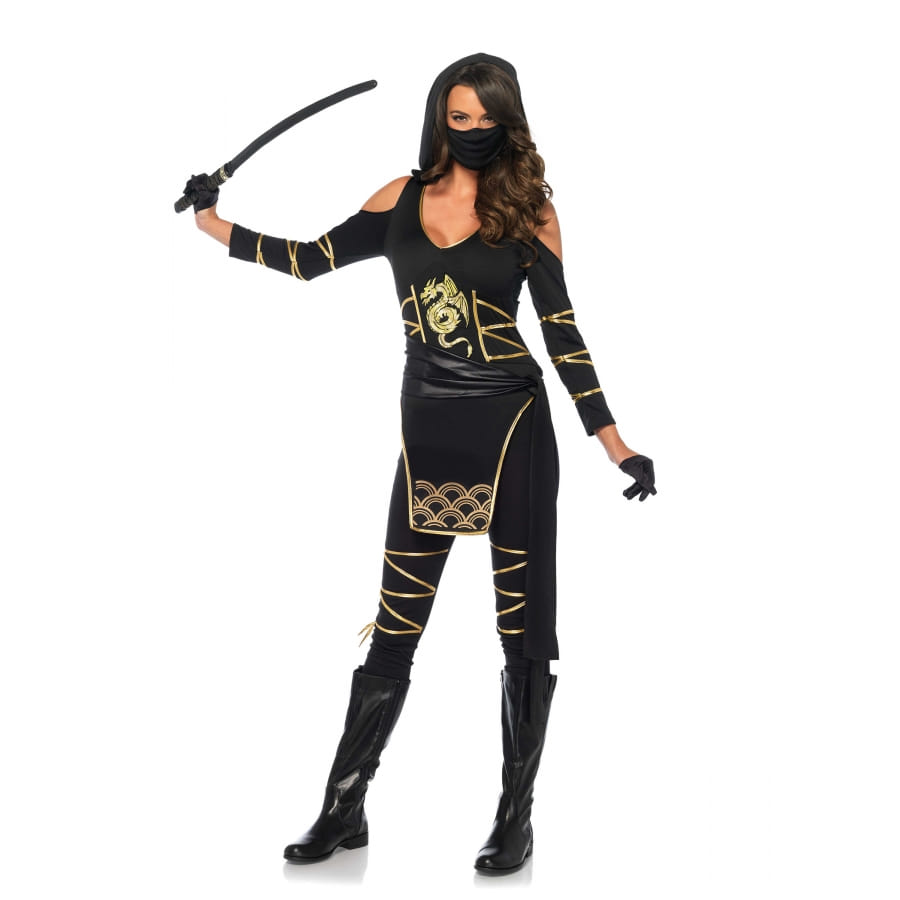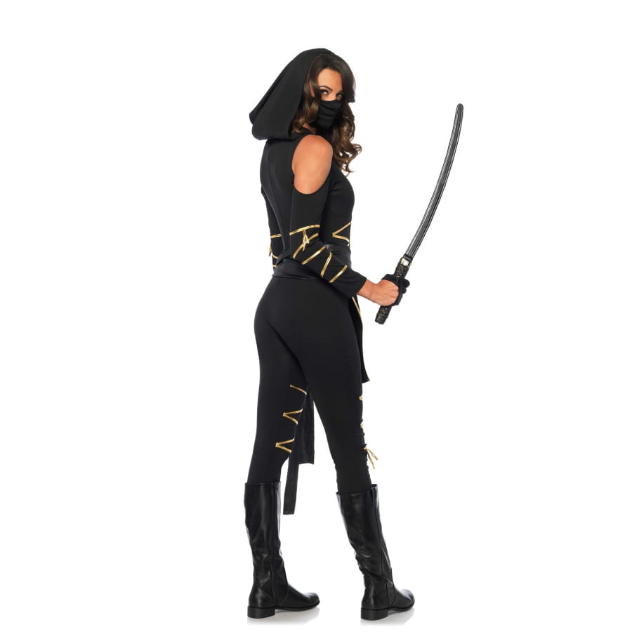 Elle est composée d'une combinaison à capuche en tissu élastique fin, d'une ceinture noire à nouer à la taille et d'un masque coloris noir en tissu souple.