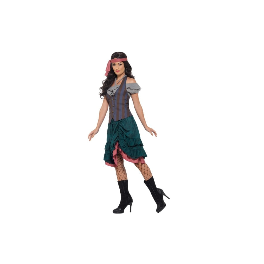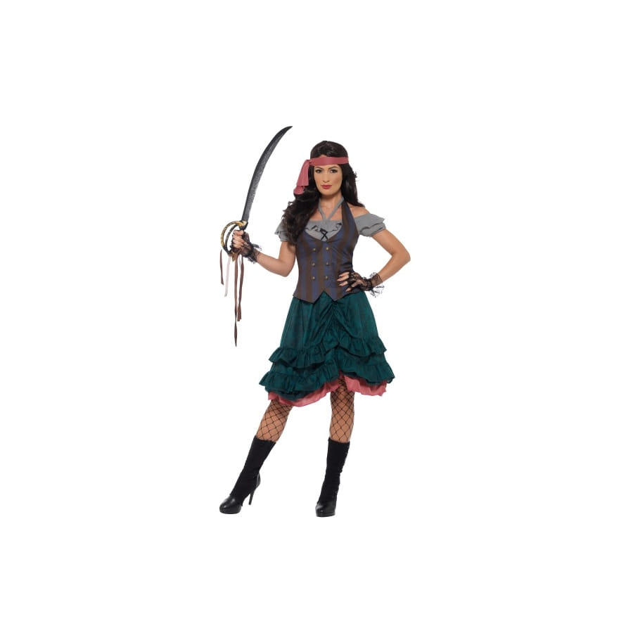 Les pirates en version féminine sont les plus dangereux ! Il est grand temps de passer à l'action avec cette tenue de femme pirate avec robe verte. Vous ne reculerez plus devant rien lors d'une fête costumée avec cet article. Le déguisement est formé par un petit haut gris avec gilet intégré. Les manches du haut sont courtes et laissent les épaules à découvert. Quant au gilet, il est à rayures bleues et marron, et agrémenté de quelques boutons dorés. Vous disposerez aussi d'une jupe de couleur verte largement évasée avec des bordures en tralala. Votre coiffure sera accessoirisée à l'aide d'un bandana rose à nouer sur le côté.