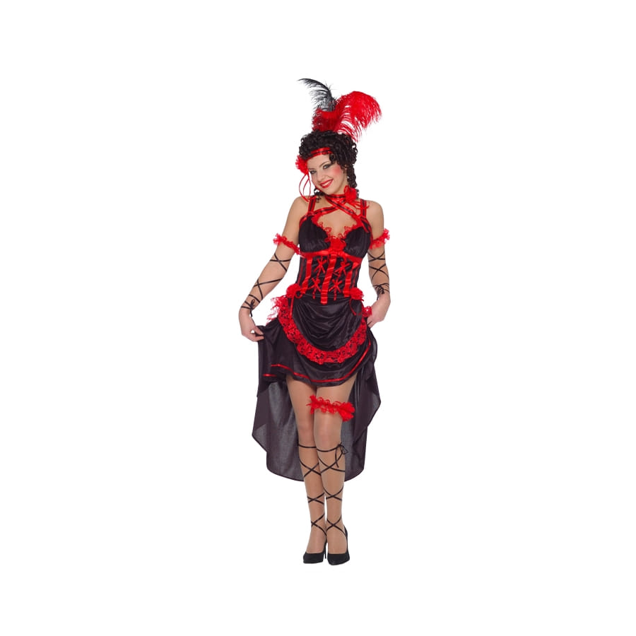 En route pour l'Amérique ! Devenez une star de cabaret avec ce charmant look au style années 20-30. Entrez dans la peau d'un personnage de western en enfilant la tenue de french cancan rouge et noire pour femme. Vous serez ainsi revêtue d'une superbe robe rouge et noire, sans manches, courte sur le devant et longue à l'arrière. Il s'agit d'un modèle à corset fabriqué en tissu à effet velours avec des liserés en dentelle aux extrémités et des petits noeuds au niveau de la taille. La fermeture s'effectue à l'aide de scratchs. La jarretière et les tours de bras sont élastiques et de couleur rouge. Un bandeau rouge est prévu pour peaufiner la coiffure.