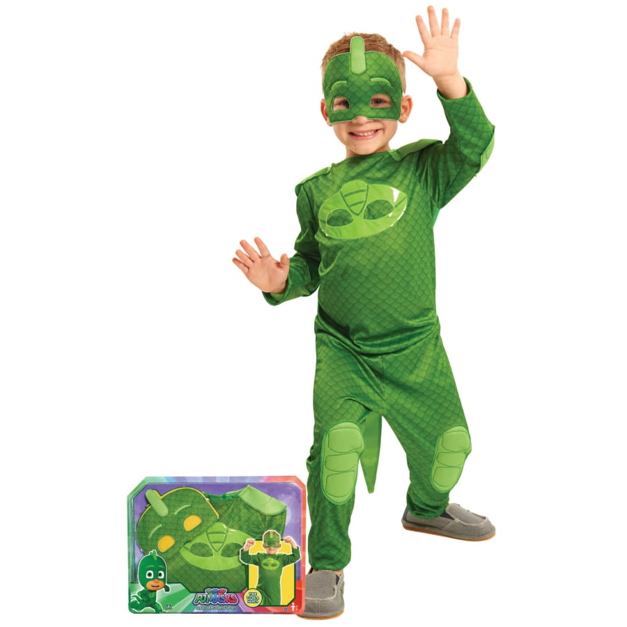 La tenue de Gluglu Pyjamasques pour enfant en coffret est un ensemble fait dans un tissu vert imprimé d'écailles.