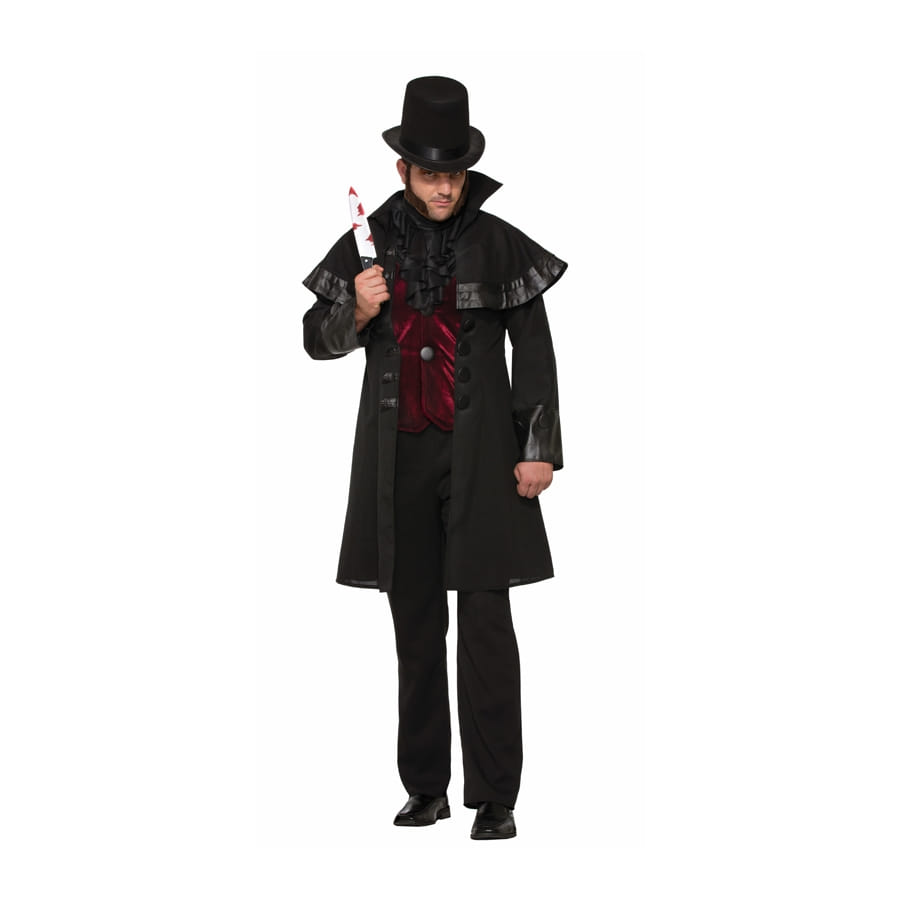 L'identité de Jack l'éventreur est encore inconnu jusqu'à aujourd'hui. Mais, ce nom désigne un tueur en série ayant commis des actes criminels dans le district Iondonien de Whitechapel. Incarnez ce personnage pour commémorer la fête des morts. L'ensemble est entièrement sombre, sauf au-dessous du jabot où la couleur grenat surpasse un peu. Cette tenue est destinée uniquement aux hommes. Le manteau avec le veston attaché recouvre le dos juste au-dessus des genoux. De même, pour la cape qui l'accompagne. Pour avoir l'air mystérieux et ressembler à Jack l'éventreur, n'oubliez pas vos accessoires : couteau et chapeau et rehaussez le col.