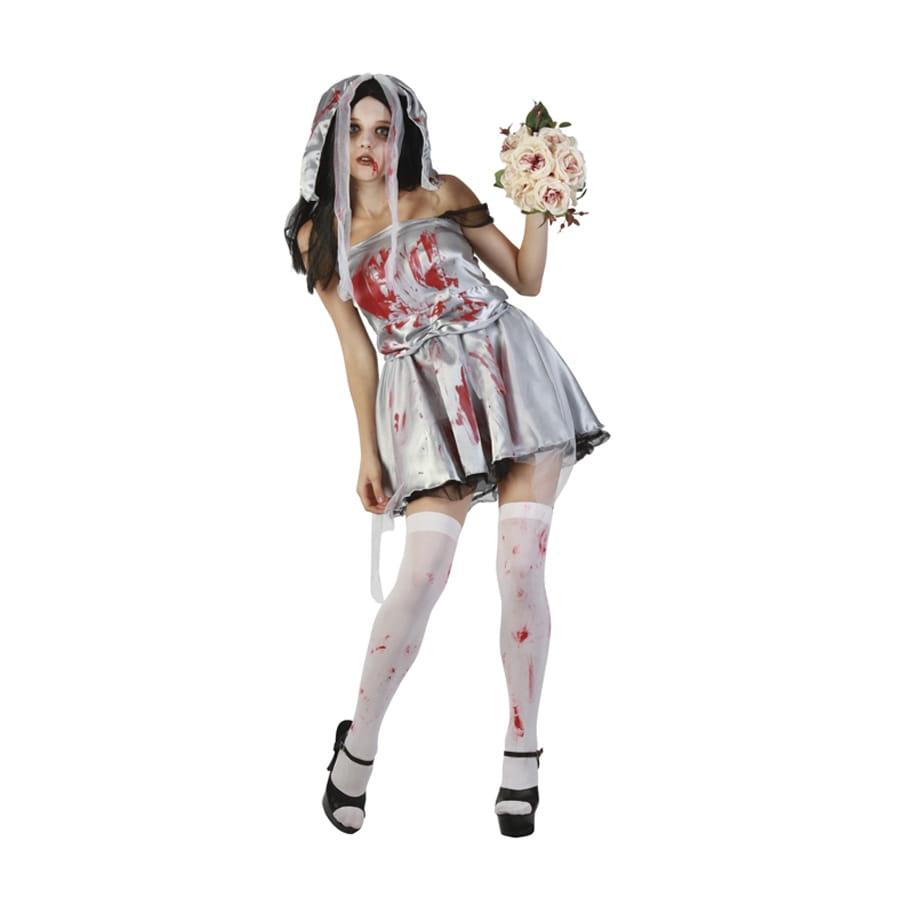 Envie d'être stupéfiante, sensationnelle et originale ? Optez pour cette tenue de mariée zombie robe courte, un costume à la fois sexy et extravagant qui va vous transformer en un clin d'oeil en une belle mariée, ou presque, tout droit sortie du monde des morts. Il est composé d'une robe bustière courte, de couleur argentée, avec de fausses taches de sang situées un peu partout sur la surface. Un jupon noir est cousu sous la robe pour lui donner plus de volume. Et une coiffe avec voile, parfaitement assortie à la robe, termine à merveille cette tenue. Bien entendu, cette dernière est conçue pour femmes. Ce sera le meilleur moyen pour effrayer vos amis ou votre mari lors de la soirée Halloween ou à l'occasion d'une Zombie walk.