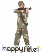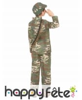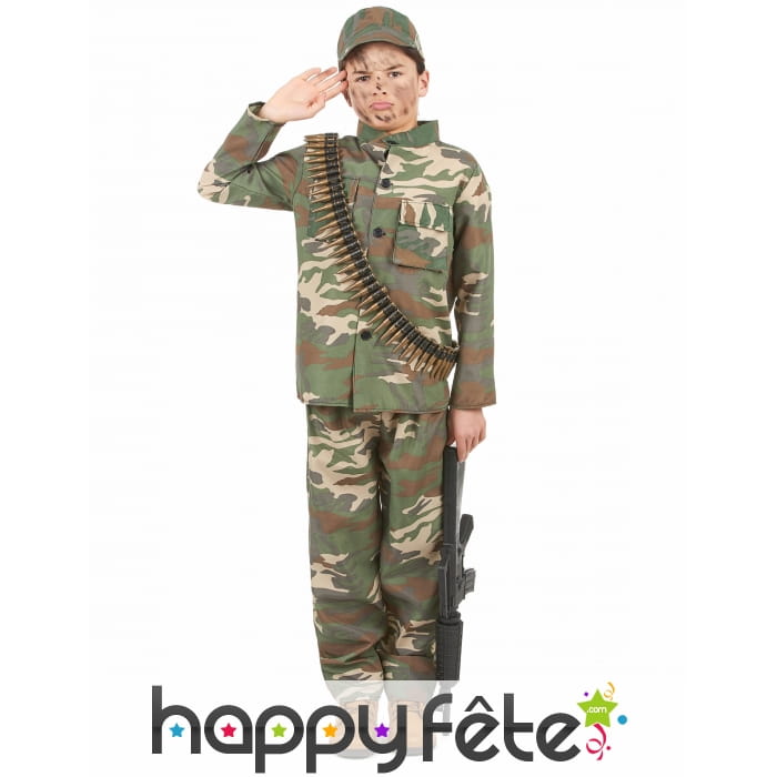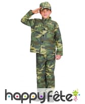 Profitez d'une fête sur le thème de la guerre ou action et aventure pour faire de votre petit un soldat américain avec cette tenue de militaire pour petit garçon. Le déguisement est constitué d'une veste à col mao, avec des manches longues, s'ouvrant sur le devant par des boutons et munie de 2 poches sur la poitrine. Le bas est fait d'un pantalon à taille élastique, et n'oublions pas la casquette assortie à la tenue pour couronner le tout. Cet ensemble est de couleur verte, en imprimé camouflage, comme les vrais habits de militaire. Pour que votre enfant soit un vrai combattant, faites un petit tour sur notre site et retrouvez les accessoires qui donneront plus de réalisme à la tenue, dont une arme ou une ceinture de balles.