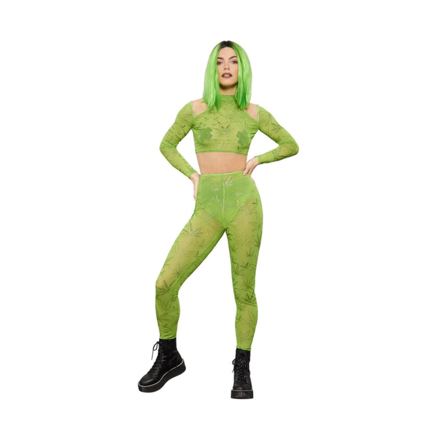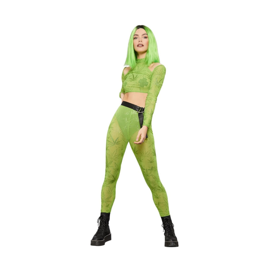 Marquez le coup lors d'une soirée sur le thème de la nature, avec la tenue Cannabis pailletée pour femme.