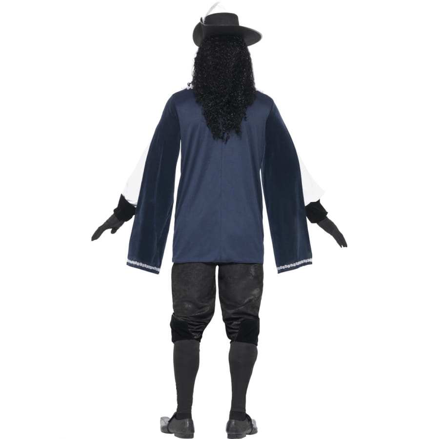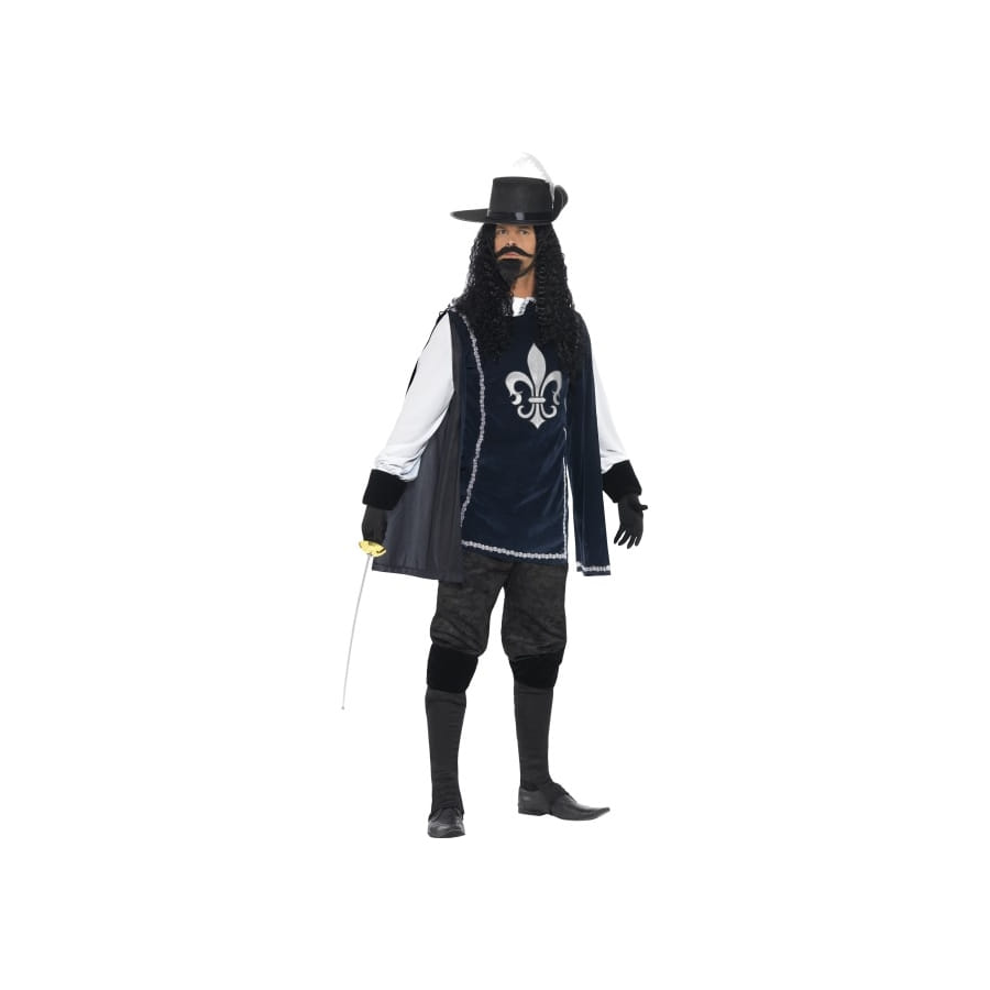 Si vous êtes à la recherche d'un déguisement de mousquetaire de bonne qualité et assez réaliste pour que vos amis vous disent que votre déguisement est très réussi, nous avons ce qu'il vous faut : une tenue de mousquetaire de couleur noire. Ce costume est formé d'un haut de couleur noire et blanche avec le dessin d'une fleur de lys au milieu, d'un chapeau de couleur noire avec une plume blanche, une paire de gants de couleur noire, une paire de couvre-bottes, noires également, et enfin une barbe et une moustache noire. Autant d'éléments qui pourront parfaire ce déguisement, qui est proposé en tailles L et M pour homme.