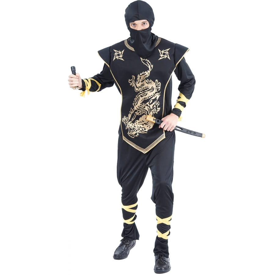 Les ninjas ont besoin d'être bien à l'aise dans leur tenue pour pouvoir effectuer leurs innombrables acrobaties. La tenue de ninja noir et doré pour adulte fera de vous un véritable maître en arts martiaux. Le haut est de couleur noire, à manches longues, avec des bandes de tissu jaunes à nouer autour des avant-bras. Un plastron a été intégré au haut. Il a été conçu en feutrine épaisse de couleur noire, avec des motifs dragon et nunchakus imprimés dans une couleur dorée. Le pantalon est noir et vous disposerez également de bandes jaunes à nouer autour de vos mollets. La cagoule est noire et ne laisse entrevoir que les yeux. L'ensemble haut, pantalon et cagoule a été fabriqué dans une matière souple et extensible, le costume est donc adapté à différentes tailles.