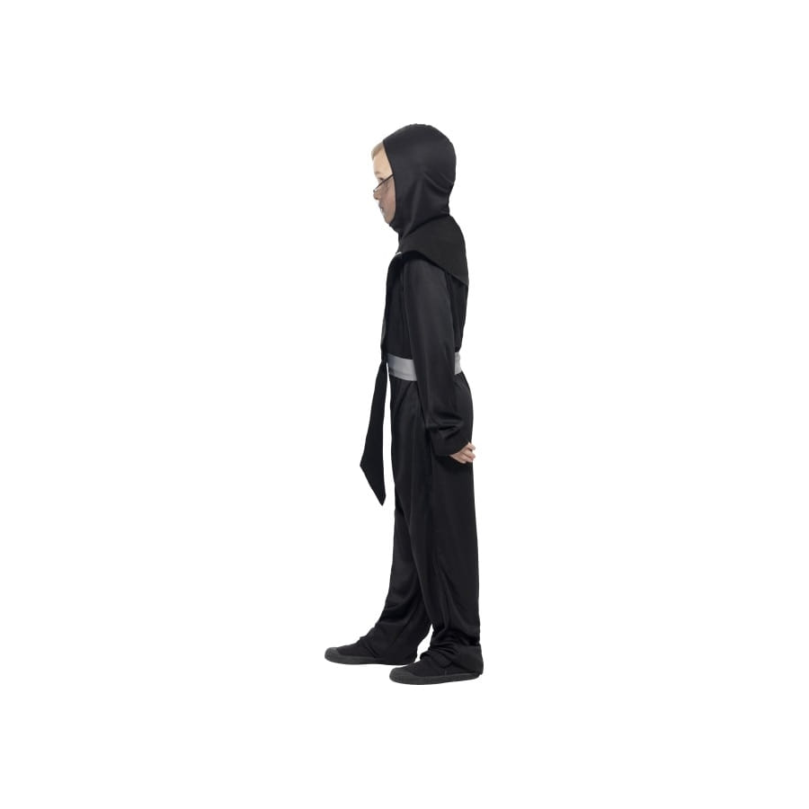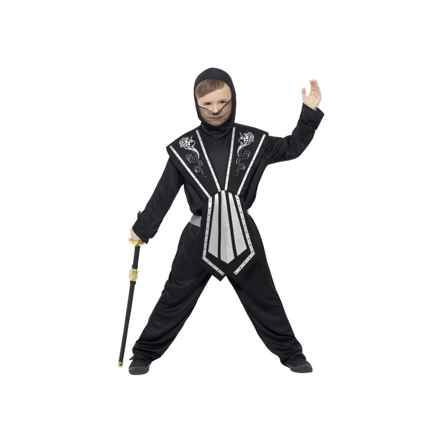 Pour devenir un petit maître ninja, rien ne vaut un beau déguisement. Cette tenue de ninja pour enfant est digne de votre petit guerrier. Elle comprend plusieurs éléments de couleur noire. La tenue est principalement constituée par une combinaison à manches longues, très confortable, qui permet d'effectuer des mouvements amples. Vous disposerez aussi d'un tabard de couleur noire, magnifiquement décoré d'un motif dragon imprimé sur chaque côté. Il se porte en dessus de la combinaison, tout comme la petite ceinture grise. Pour compléter l'ensemble, vous aurez affaire à une capuche noire très spéciale. Un peu comme une cagoule, elle voile la partie inférieure du visage. Le plus mignon des ninjas de l'histoire peut désormais passer à l'action !