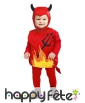 Des pans de tissu rouge tombent sur la poitrine et au bas de la taille pour simuler des flammes vives.