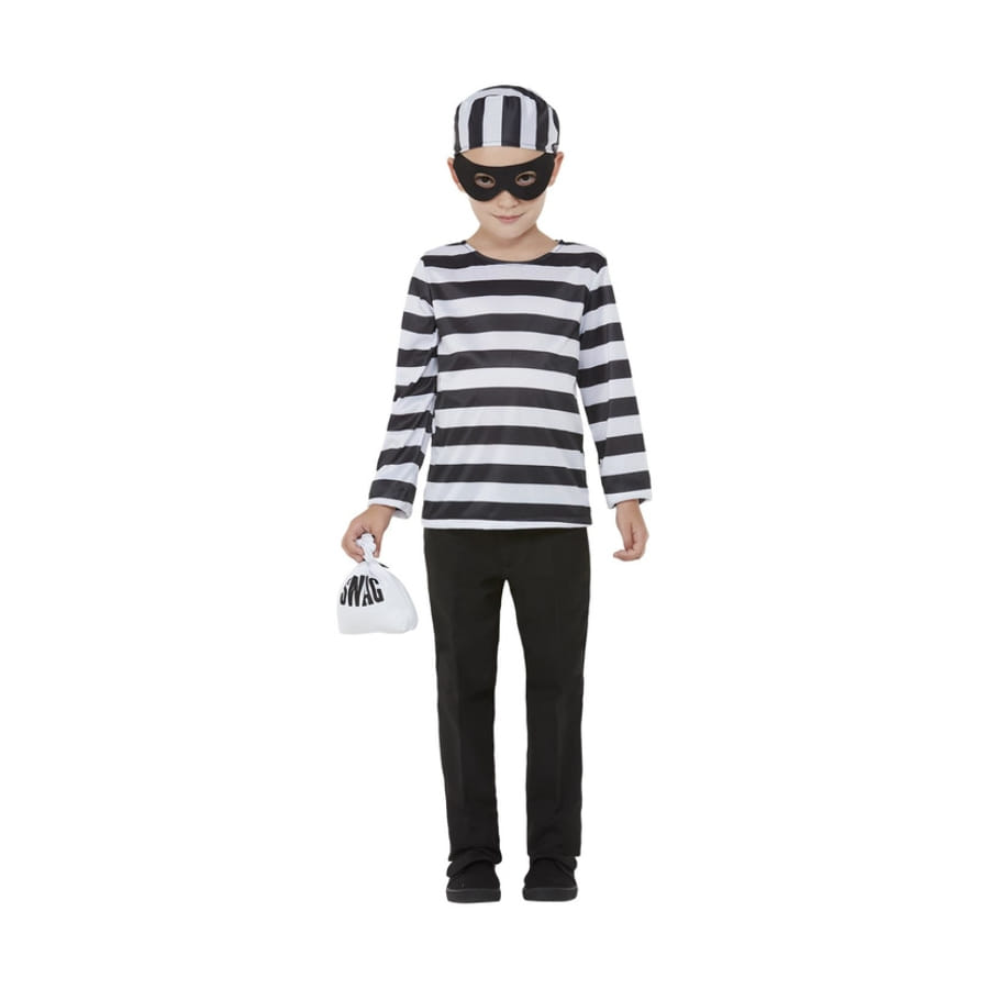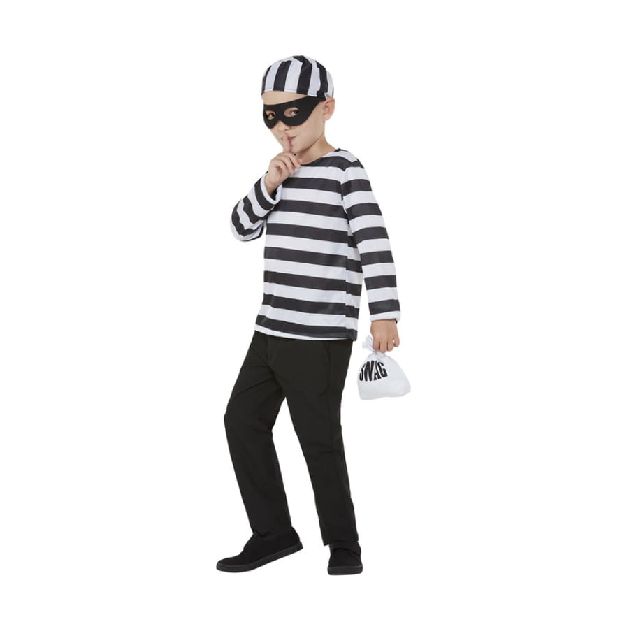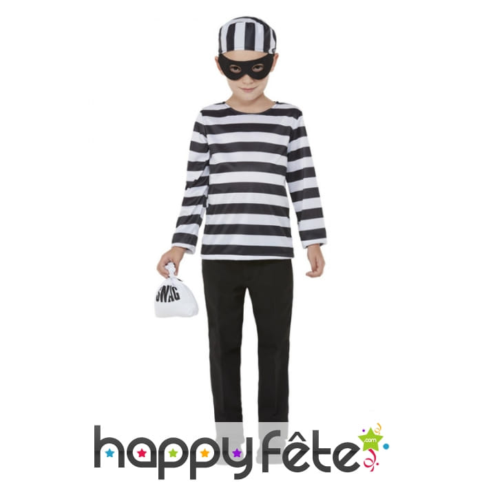 Surprenez les invités d'une soirée où les gangsters font la loi, en habillant votre fils de la tenue de petit voleur rayée blanc et noir avec sac.