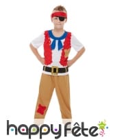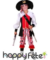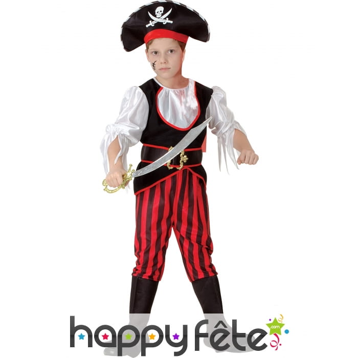 A l'abordage ! Les pirates partent à l'assaut. Il faut absolument se procurer une tenue de pirate enfant rayures noires et rouges avant d'aller combattre l'ennemi. Ce déguisement pour garçon est constitué par un petit haut de couleur noire avec liseré rouge. Ses manches et son jabot sont de couleur blanc satiné. Autour de la taille, vous fixerez à l'aide d'un scratch, une ceinture noire à boucle dorée. Le pantalon qui va avec le costume est à rayures verticales rouges et noires. Il est élastique et équipé de surbottes intégrées. Le chapeau de pirate est noir et rouge, avec un motif insigne de pirate imprimé. Le déguisement est disponible en différentes tailles, pour les 4 à 12 ans.