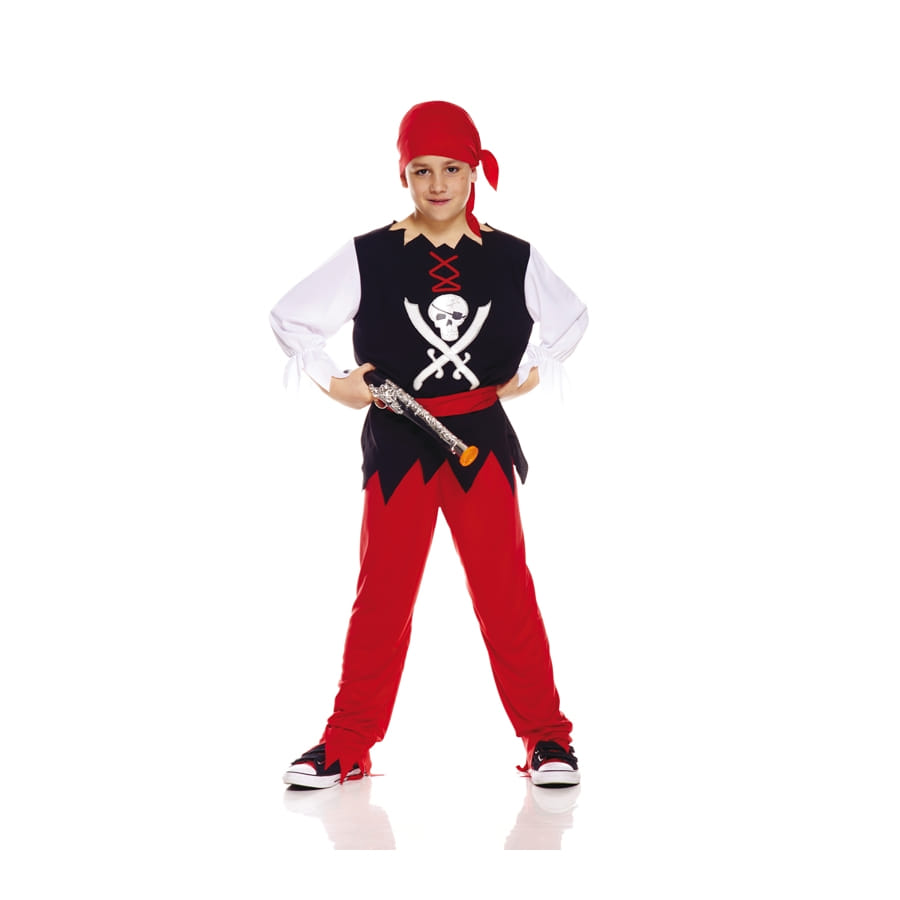 Pour ce jour spécial, votre enfant aura l'occasion de se glisser dans la peau d'un pirate à la recherche d'un trésor caché, grâce à cette tenue de pirate noir et rouge pour enfant. Le déguisement est constitué d'une chemise blanche avec un dessin semblable au sigle de la piraterie sur le devant, d'un pantalon rouge et d'une ceinture assortie à ce dernier, à mettre au-dessus de la chemise. Il y a également l'incontournable bandana, toujours de couleur rouge. Avec ce déguisement, vous pouvez ajouter quelques accessoires comme un fusil ou encore un pistolet en plastique, que vous pourrez voir sur notre site, dans la rubrique accessoires.
