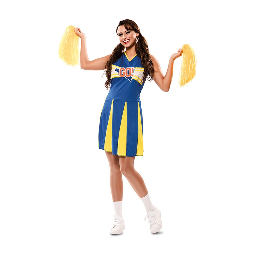 Nous vous proposons cette tenue de pom pom girl jaune et bleue pour femme.