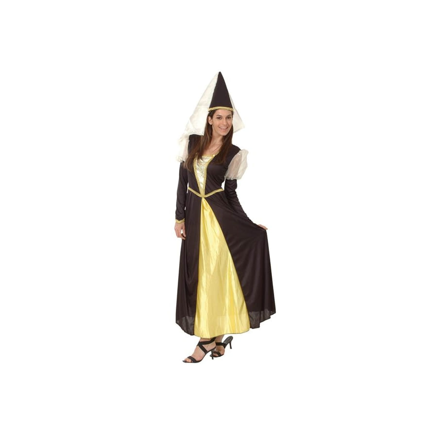 Cela fait toujours plaisir de se déguiser en princesse. Inspirez-vous de l'époque du Moyen Age pour avoir un déguisement original. Cette tenue de princesse médiévale noir et or est composée d'une longue et sublime robe de couleur noire agrémentée de quelques dorures. Le devant de la robe est de couleur or et bronze satiné. Les manches sont longues, avec la partie supérieure en voile transparent et le reste en noir. La robe est complétée par un chapeau pointu, de couleur noire avec une ligne dorée à la base. Le sommet du chapeau est doté d'un léger voile transparent qui descend jusqu'à la hauteur de la nuque. L'ensemble se porte idéalement avec des talons hauts, lors d'une soirée à thème médiéval.