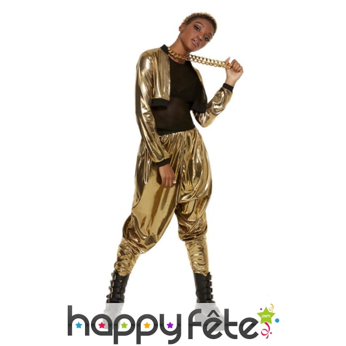La tenue de rappeuse dorée des années 80 sera parfaite pour enflammer une soirée déjantée ou le Hip Hop rétro est à l'honneur.