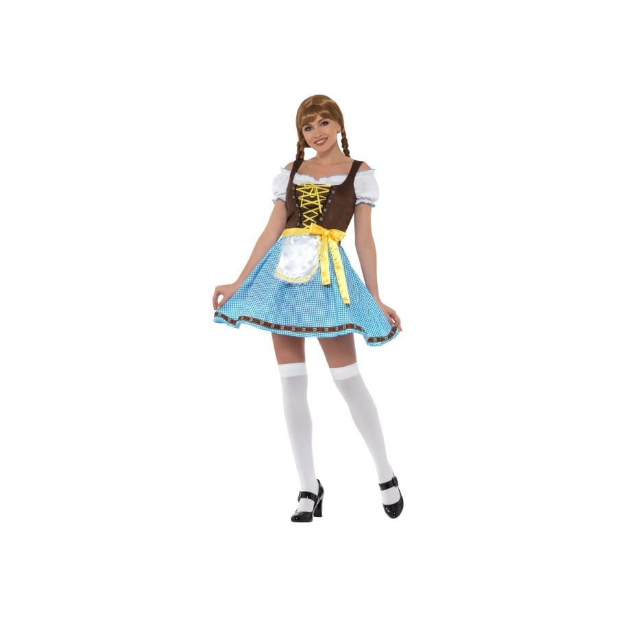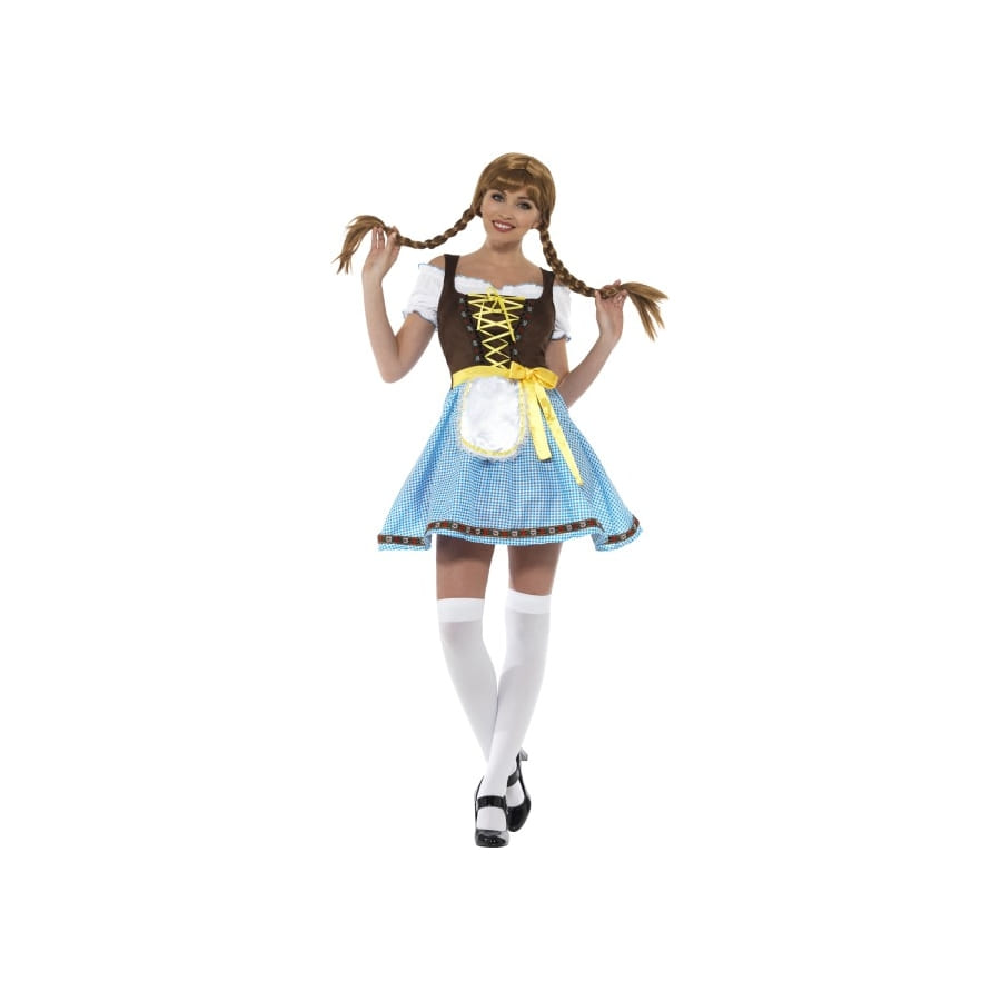 Organisez une soirée mémorable pour marquer la fin de vos années de célibat. Le thème fête de la bière est très original pour un enterrement de vie de jeune fille. Bienvenue dans l'univers des déguisements et des jeux de rôles à travers la superbe tenue de serveuse Bavaroise Oktoberfest. Elle est formée par une courte robe évasée, de couleur bleu ciel. Un petit tablier blanc à bords jaunes a été cousu sur le devant au niveau de la taille. Retrouvez également un joli noeud de couleur jaune à la taille. Un haut blanc et un faux corsage marron à rubans jaunes viennent s'ajouter à l'ensemble. Vous obtenez alors un déguisement folklorique très original, qui vous donnera une allure de charmante serveuse ou d'écolière sexy.