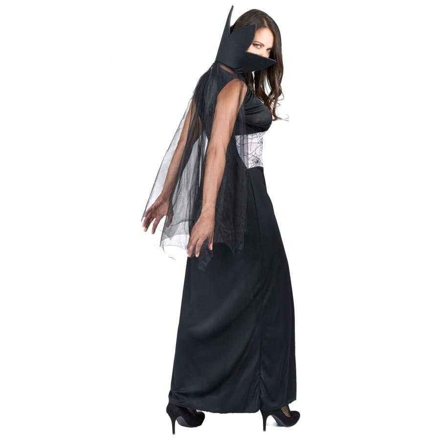 Mesdames, si pour halloween, vous avez décidé de jouer la carte de la séduction, nous avons le bon costume pour vous. Il s'agit de la tenue de sorcière araignée jambe échancrée. Cette robe de couleur noire, taillée dans un tissu assez fin et fluide, fera tourner des têtes à l'occasion de la fête des morts. Très échancrée au niveau de la jambe droite, elle épousera également la forme de votre corps pour le mettre en valeur. Un voile recouvre la robe au niveau du haut. Un col noir avec des motifs de toile d'araignée se détache de l'ensemble et donne encore plus de style au costume.
