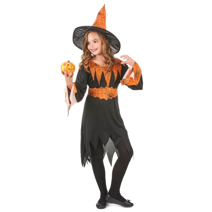 Si votre petite fille a un faible pour les histoires de sorcières, pourquoi ne pas s'en inspirer pour son déguisement d'halloween ? Misez sur cette tenue de sorcière araignée orange et noire, enfant, que vous pouvez commander sur notre site. Elle est constituée d'une robe noire à manches longues. Ses bords sont déchiquetés en dents de scie. Un tissu orange déchiré de façon irrégulière, avec des motifs d'araignées et de toile d'araignées, orne son col et le bout de ses manches. La ceinture et la calotte du chapeau de petite sorcière sont aussi conçues dans la même matière, avec le même style de découpe. La tenue de sorcière araignée orange et noire, enfant, est un costume d'halloween qui en jette !