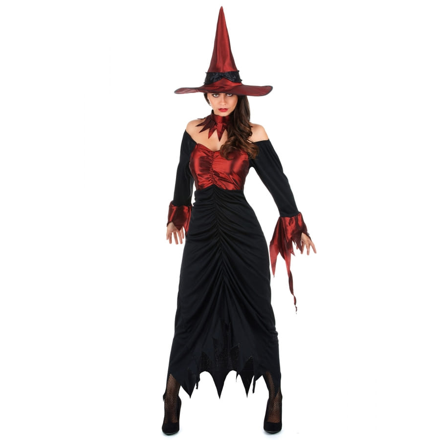 Un costume réussi pour la fête des morts dépend du style de votre déguisement. Misez sur une tenue à la fois simple et qui vous donnera un look impeccable. Pour ce faire, nous vous proposons la tenue de sorcière haut rouge satiné pour femme. Ce produit reste disponible sur notre site. Il s'agit d'une longue robe de couleur noire. Un tissu rouge effet satiné en recouvre le buste. Ce même tissu se retrouve au niveau des bouts de chacune des manches longues de la robe. Ses bords découpés en dents de scie donnent un effet déchiqueté. Ce costume contient aussi un collier rouge ainsi qu'un chapeau de sorcière assorti. Le collier s'attache grâce à un velcro par l'arrière.