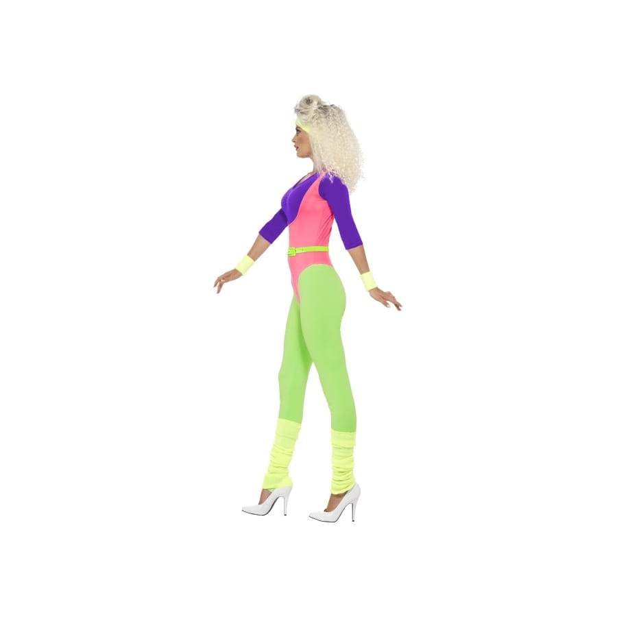 Dans les années 80, tous portaient des couleurs vives, autant dans les tenues du quotidien que dans les tenues pour aller en soirée, pour des petites sorties, et même pour faire du sport. Ainsi, nous avons eu l'idée de vous proposer ce déguisement : une tenue de sport des années 80 pour femme. Pour ce costume, nous vous proposons un body de couleur rose et violette pour le haut, et verte et jaune pour le bas, un bandeau de couleur jaune et des bandes pour poignets, de couleur jaune également. De la couleur, vous en aurez à revendre avec cette tenue proposée en tailles M, S et XS, uniquement pour vous, Mesdames.