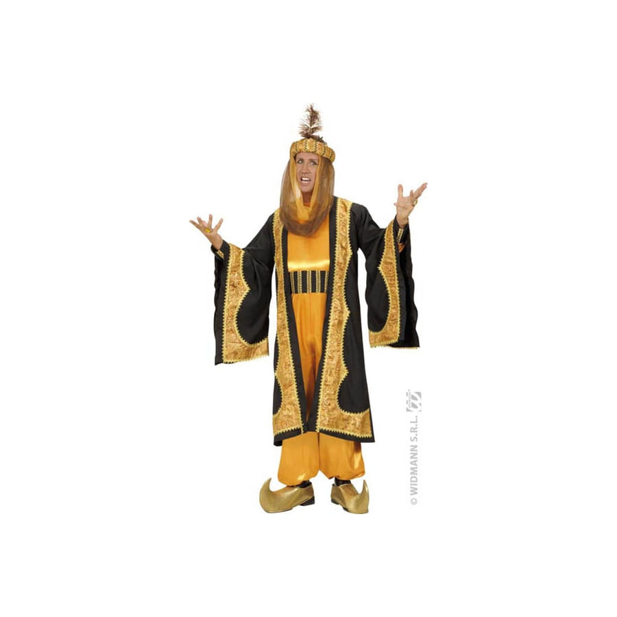Partez à la conquête du Moyen-Orient et gouvernez le sultanat avec cette tenue dorée de sultan de qualité supérieure ! Nous vous proposons une panoplie très complète composée de cinq éléments essentiels : un manteau à brocarde, une combinaison, une ceinture, une coiffe avec voile et une paire de sur-chaussures. L'ensemble est de couleur noire et dorée. La combinaison adopte un bel effet satiné. Le manteau est long et possède des manches longues largement évasées. La coiffe est parfaitement assortie à l'ensemble. Ce déguisement est conçu pour homme et est parfaitement approprié pour une soirée déguisée, un thème autour des mille et une nuits ou oriental !