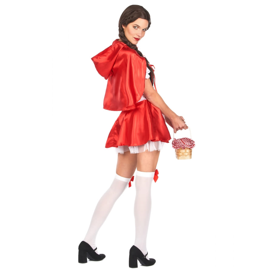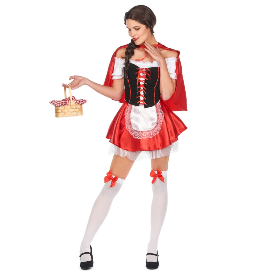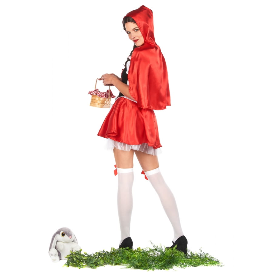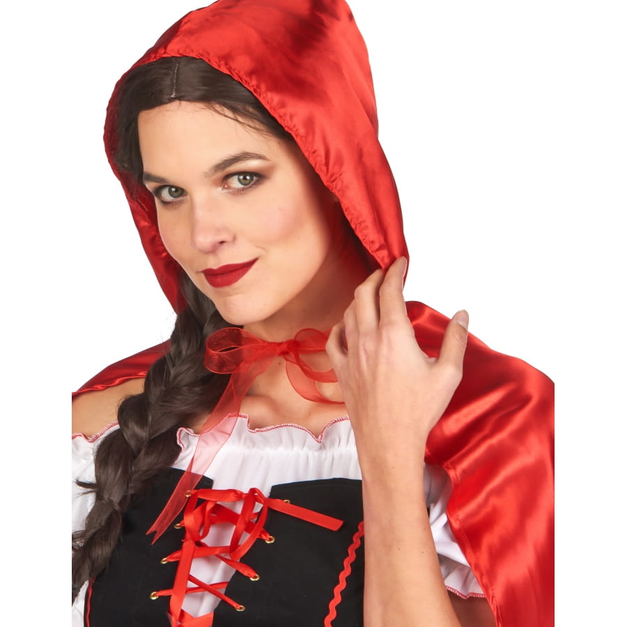 Allez à un carnaval ou une fête déguisée avec un costume riche en originalité ! Si cette idée vous plaît, nous avons l'article qui y correspond. En effet, nous vous proposons la tenue du petit chaperon rouge pour femme adulte. Cet article sous le thème Disney reste disponible sur notre site. L'ensemble compte une petite robe et une cape à capuche. La robe présente un haut en corsage noir et rouge, avec une manche blanche qui laisse l'épaule dégagée. La jupe rouge qui compose la tenue mesure 30 cm de longueur et elle est doublée d'un fin jupon blanc. Un petit tablier blanc se trouve rattaché à celle-ci. Une cape rouge, à capuche et en tissu satiné, complète ce déguisement de chaperon rouge.