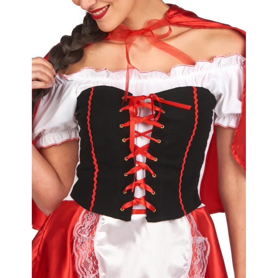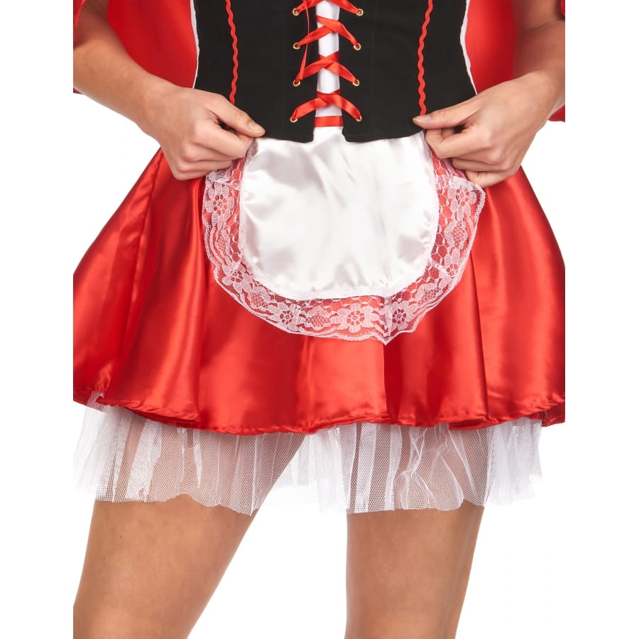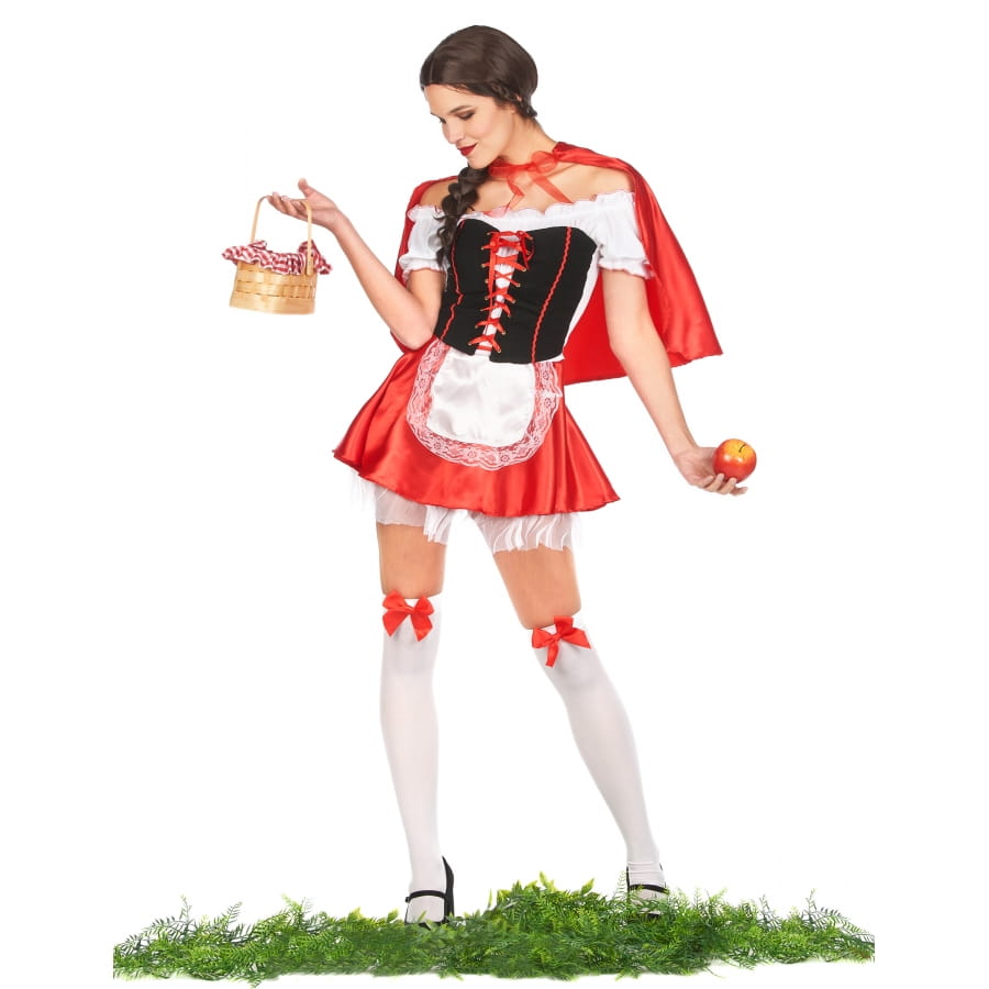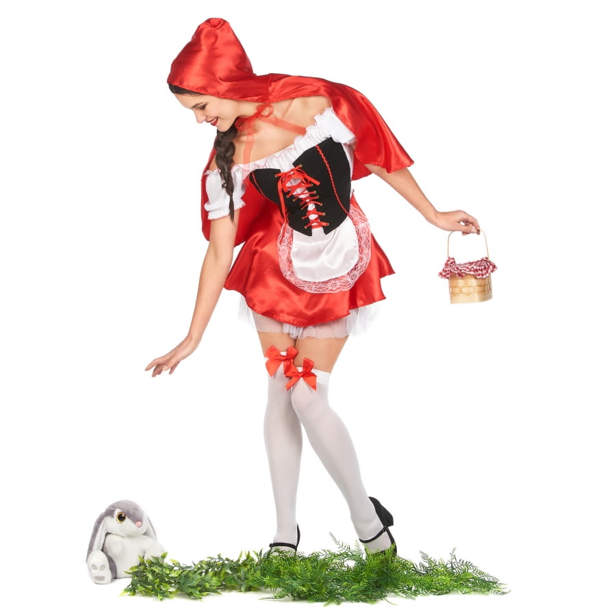 Allez à un carnaval ou une fête déguisée avec un costume riche en originalité ! Si cette idée vous plaît, nous avons l'article qui y correspond. En effet, nous vous proposons la tenue du petit chaperon rouge pour femme adulte. Cet article sous le thème Disney reste disponible sur notre site. L'ensemble compte une petite robe et une cape à capuche. La robe présente un haut en corsage noir et rouge, avec une manche blanche qui laisse l'épaule dégagée. La jupe rouge qui compose la tenue mesure 30 cm de longueur et elle est doublée d'un fin jupon blanc. Un petit tablier blanc se trouve rattaché à celle-ci. Une cape rouge, à capuche et en tissu satiné, complète ce déguisement de chaperon rouge.