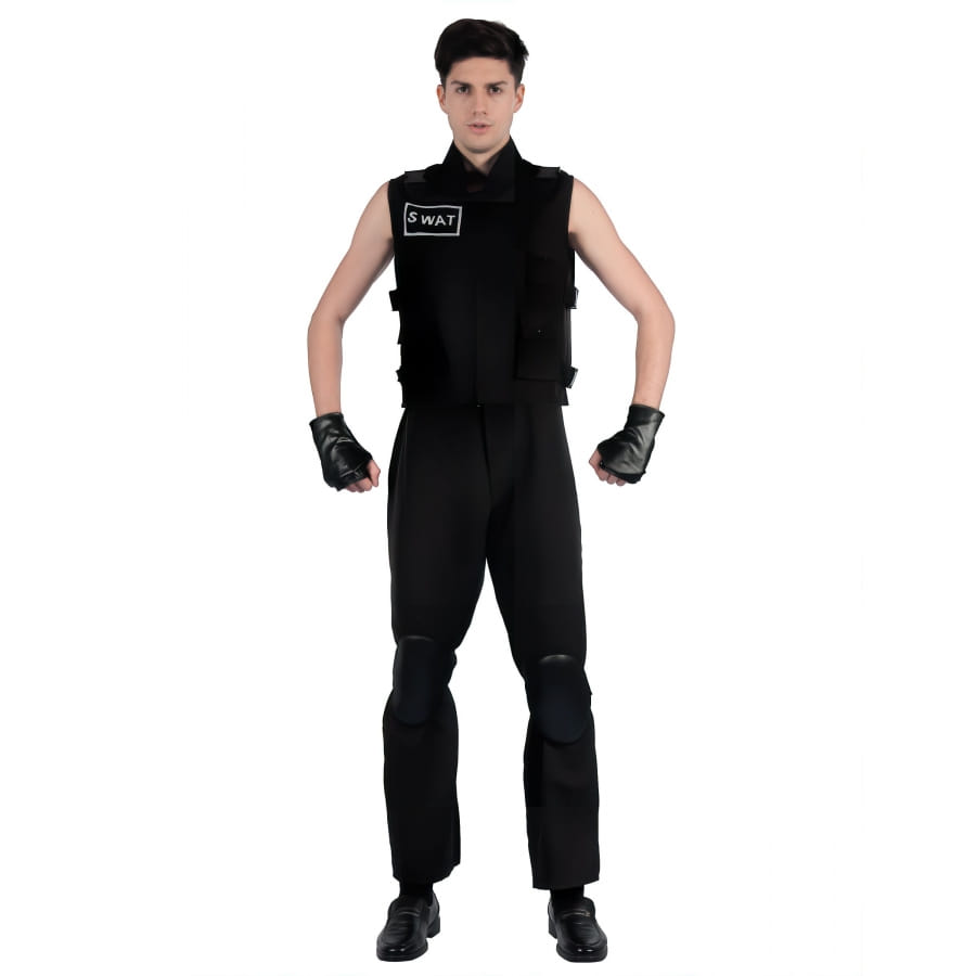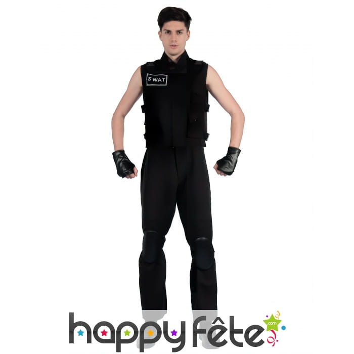 Pour compléter votre look de dur à cuire, nous avons ajouté une paire de mitaines en tissu brillant noir ainsi que des genouillères assorties. Parce que, oui, on sait qu'un bon agent du SWAT est toujours prêt à se jeter à terre pour une raison ou pour une autre.