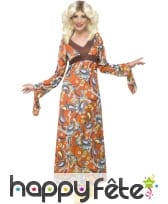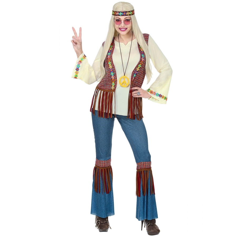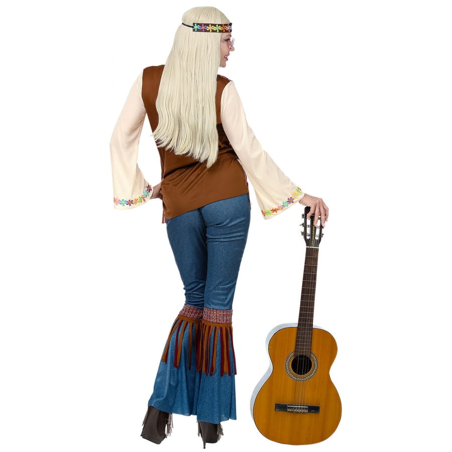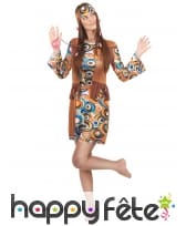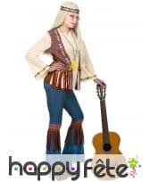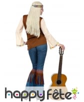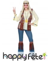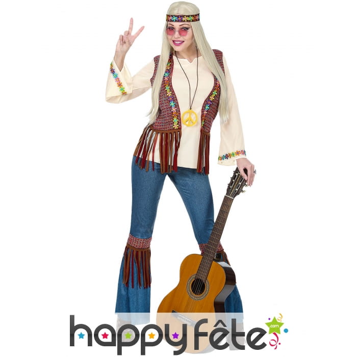 Peace and Love dans cette Tenue hippie avec veste marron à franges, femme.