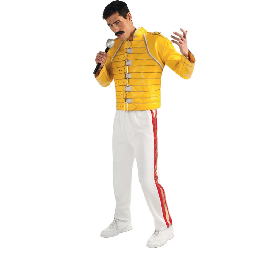 Les fans de Freddie Mercury vous envieront dans ce costume ! A porter spécialement pour la fête de la musique, cette tenue jaune de Freddie Mercury va faire des ravages. Sous licence Queen, elle comprend un ensemble veste et pantalon inspirés du look de la star. La veste est à manches longues, de couleur jaune, conçue dans un tissu imitation cuir. Elle présente un design très spécial avec des boucles sur le devant. Retrouvez aussi des finitions dorées cousues aux extrémités. Le pantalon est de couleur blanche agrémenté de liserés dorés et rouges sur les côtés. Il sera adapté à toute morphologie puisque que la taille est élastique.