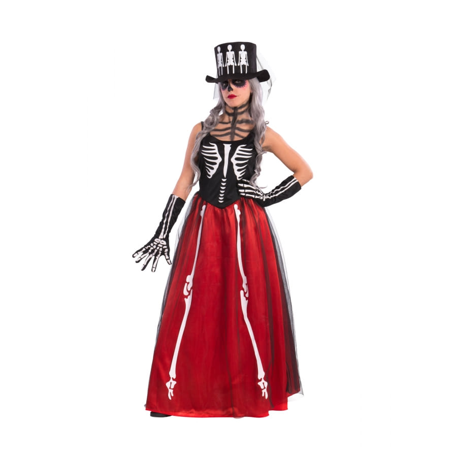 Il s'agit d'un ensemble avec des motifs de squelette et comprenant un chapeau, une paire de gants et une robe.