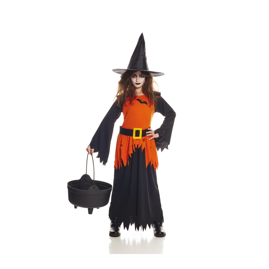 Que serait Halloween sans les jolies petites sorcières qui parcourent les rues du quartier ? Avec ce costume, votre fille sera non seulement la plus mignonne, mais aussi la plus effrayante de toutes. Tenue longue de sorcière noire et orange se présente comme une longue robe noire avec des bords en dents de scie. Le haut est de couleur orange, avec une ceinture qui enserre la taille. Le tout est complété par un chapeau de sorcière noir. Avec une tenue aussi jolie et originale, la tournée des bonbons sera un succès pour votre petite fille.