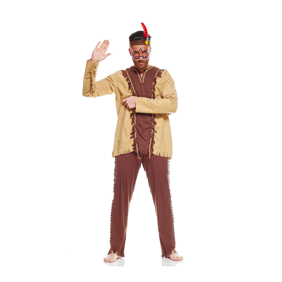 Les indiens dans les westerns possèdent un style vestimentaire unique en son genre. Lancez-vous dans l'aventure en adoptant un look traditionnel indien lors de la prochaine soirée déguisée. Vous n'aurez qu'à vous procurer cette tenue marron foncé et clair d'indien adulte. Elle comporte un ensemble haut et pantalon assortis. Le haut est à manches longues, de couleur beige, avec une touche de marron sur le devant. Le vêtement est agrémenté de franges. Le pantalon est de couleur marron foncé. Il comporte également des franges qui lui confèrent un style original. Le costume ne s'arrête pas là ! Vous disposerez aussi d'un bandeau marron à plumes pour vous servir de coiffe.