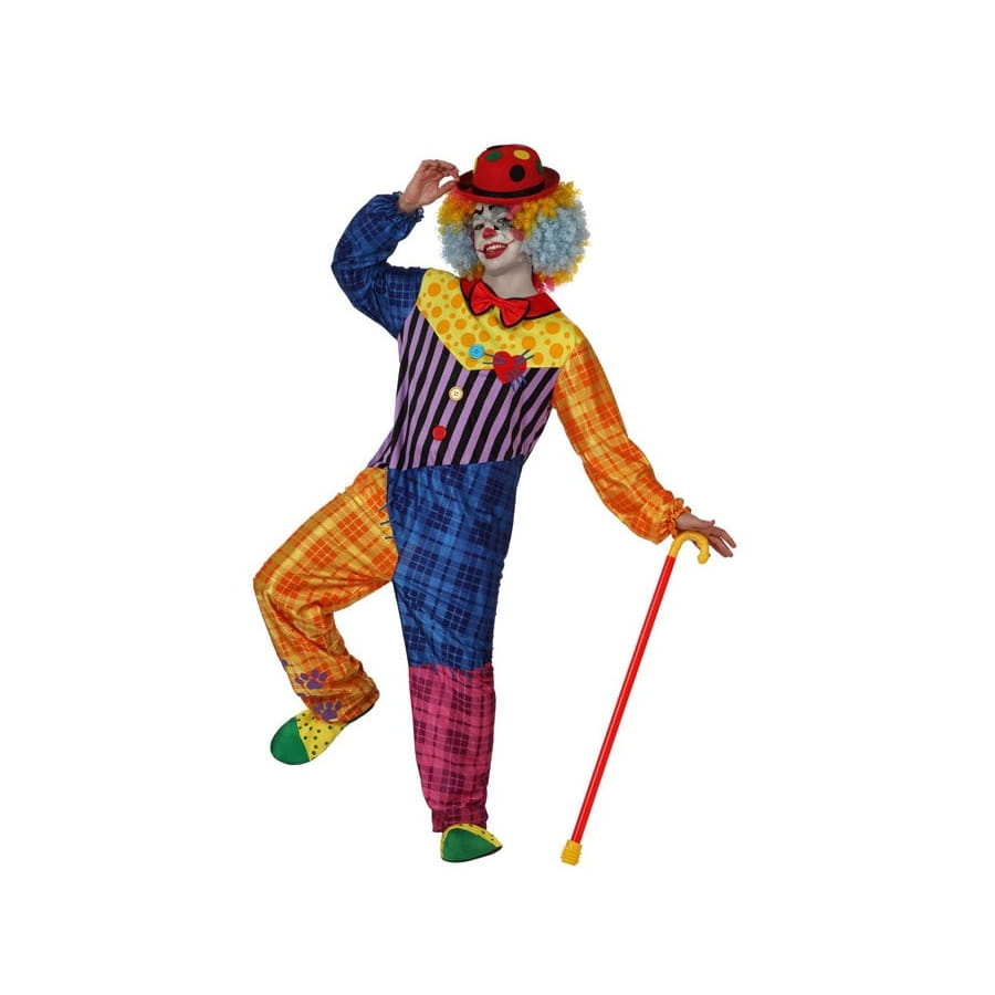 Vous avez rendez-vous avec l'humour ? Les clowns sont toujours les bienvenus aux goûters d'anniversaire. Vous êtes engagé pour rôle à une seule condition : revêtir cette tenue multicolore de clown pour adulte. Il s'agit d'une combinaison très spéciale caractérisée par ses multiples couleurs et ses motifs carreaux, rayures et pois répartis par ci par là. La combinaison est à manches longues, équipée de gros boutons sur le devant, ainsi que d'un noeud papillon rouge. Retrouvez aussi un coeur rouge cousu sur le côté gauche. Des élastiques ont été intégrés sur le bas des manches et des jambes. Le vêtement se referme à l'aide de scratchs situés à l'arrière. Vous pouvez compléter la tenue en commandant des accessoires de clown sur happyfete : perruque, chapeau, nez rouge, etc.