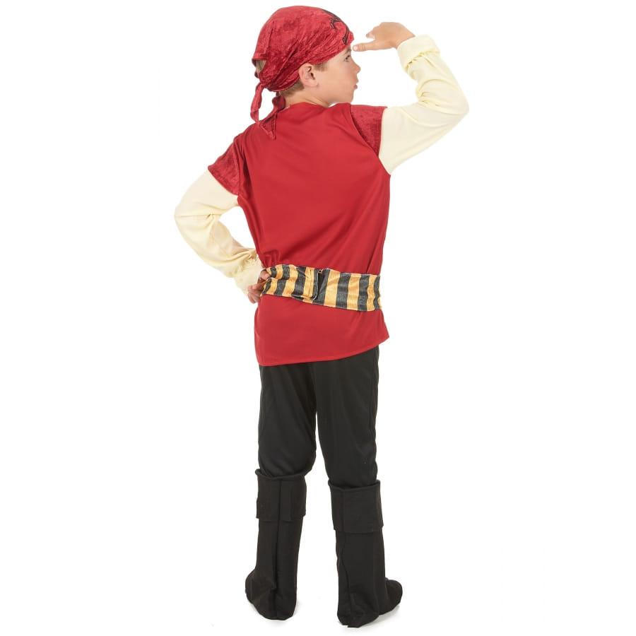 Réservez le meilleur des déguisements de pirate pour votre petit garçon, à l'occasion de la fête des morts. Pour ce faire, misez sur la tenue pirate rouge pour enfant imitation velours. Elle reste disponible sur notre site. Cet article compte un pantalon noir, fabriqué dans un tissu satiné. Il se prolonge en une paire de sur-bottes en feutrine, pour donner un effet très réaliste. Le haut se présente sous la forme d'un T-shirt bordeaux, à manches longues beiges. Une tête de mort noire se trouve imprimée sur le côté gauche de ce haut en tissu aspect velours. Le bandana assorti porte le même motif. Une ceinture rayée orange et noire complète cet ensemble.