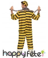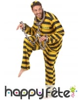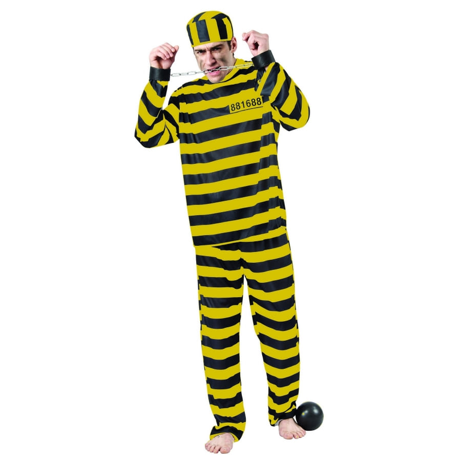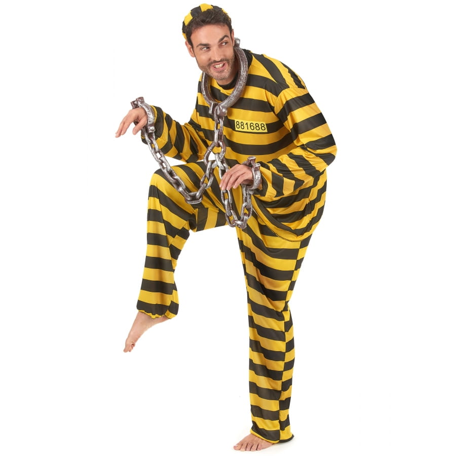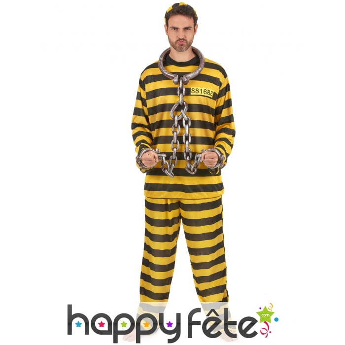 Incarnez un véritable bad boy à l'occasion d'une fête à thème. Fraîchement évadé de prison, vous décidez de vous pointer à une soirée déguisée ! Pour jouer le jeu, rien de plus simple : entrez dans cette tenue rayée jaune et noire de prisonnier, adulte. Le déguisement comprend un ensemble t-shirt et pantalon à rayures horizontales jaunes et noires. Le t-shirt est à manches longues et un numéro matricule a été imprimé au niveau du torse. Le pantalon est équipé d'un élastique à la taille pour plus de confort. Disposez également d'une petite coiffe de couleur assortie. N'hésitez pas à commander l'une de nos innombrables paires de menottes pour rendre votre costume encore plus réaliste.