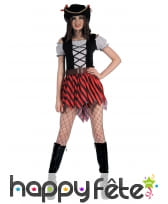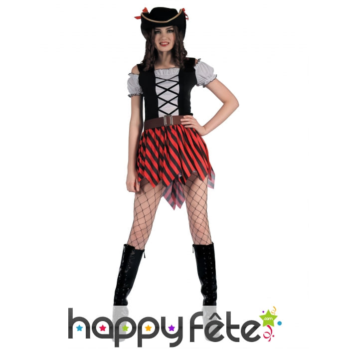 Commençons par le clou du spectacle : cette robe. Avec sa coupe plus courte à l'avant, elle a été conçue pour les femmes audacieuses et confiantes. Le bustier noir et blanc contraste joliment avec la jupe rayée de rouge et de noir, apportant une touche d'originalité à ce costume de pirate. Et les manches bouffantes courtes ? Non seulement elles ajoutent une pointe de charme, mais les élastiques les rendent aussi super confortables.