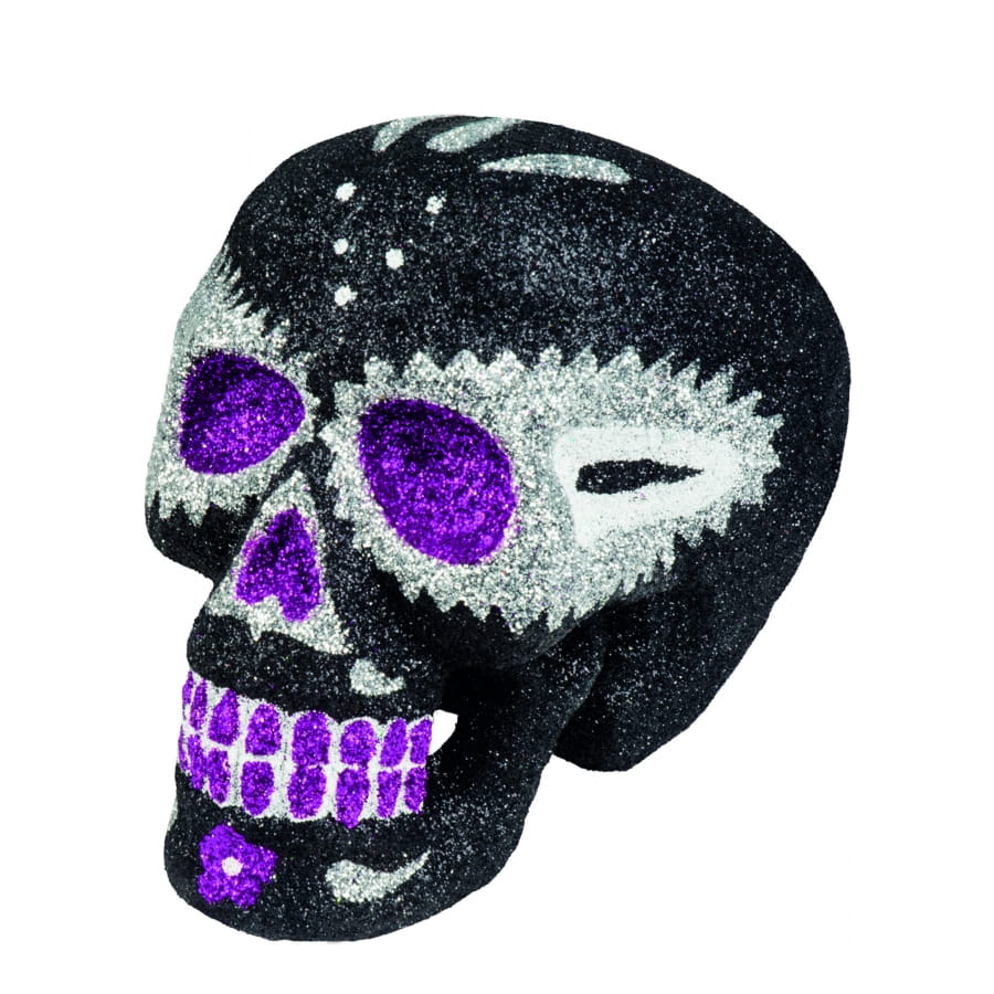 Avec son aspect traditionnel et son design coloré, ce crâne s'intègrera parfaitement à une décoration d'intérieur pailletée pour le soir d'halloween.