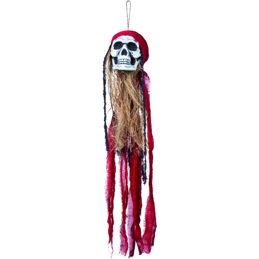 Un décor de tête de pirate pour une fête ayant pour thème piraterie et corsaire. Vous pourrez placer cette décoration ou même la suspendre. La tête de mort est blanche, avec des cheveux blonds et un bandeau rouge sur la tête. Vous pourrez aussi vous en servir pour halloween ou un anniversaire.