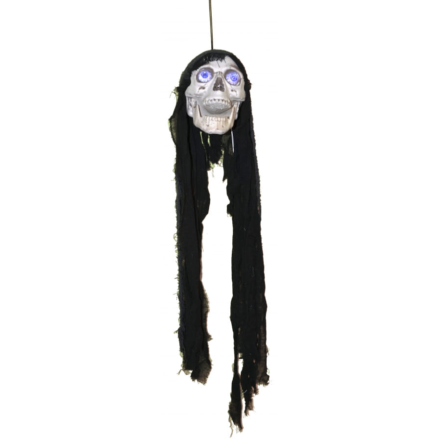 Un son macabre et sinistre se fait entendre pendant votre soirée d'Halloween ! Voilà un effet spécial qui en vaut la peine. Cette tête de mort de 70 cm de dimension est à la fois un superbe élément décoratif pour votre chez vous, mais il va aussi faire fuir les froussards. En fait, ce crâne est à la fois lumineux et sonore. Dès qu'il entend du bruit, il se met à parler et ses yeux commencent à s'illuminer, comme par magie ! Ce modèle de couleur blanche et noire fonctionne avec 3 piles, non fournies avec l'article.