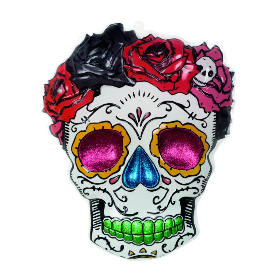 Cette décoration murale arbore une tête de mort maquillée du traditionnel parage du Dia de los muertos.