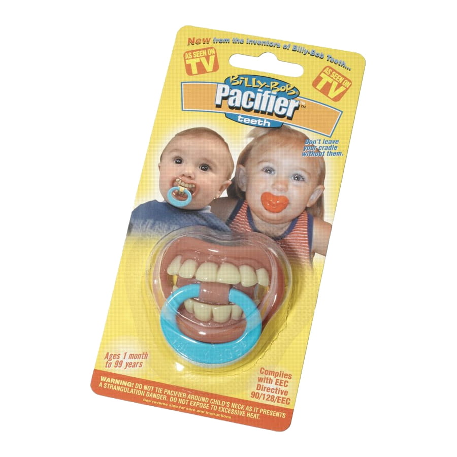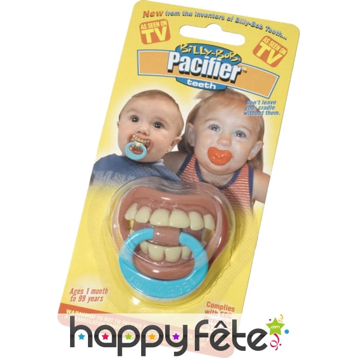 Tétine avec dentier, pour bébé fille ou garçon, de couleur beige, bleue et blanche. Cet accessoire donnera une dentition parfaite à votre bébé, lui donnant un look rigolo!