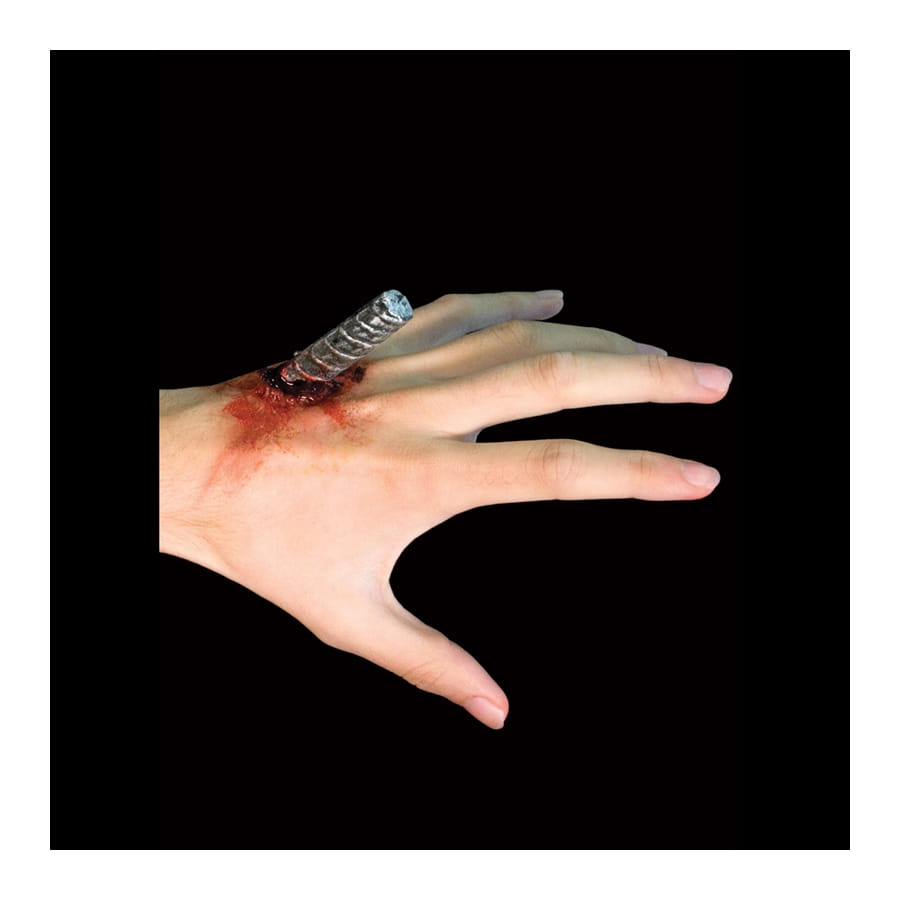 Pour effrayer vos amis, optez pour cette fausse barre de fer, à planter dans la peau. Elle est de couleur grise, dotée d'un très grand réalisme, et sera de préférence à coller sur un endroit visible du corps. Avant de l'appliquer, il faut que vous choisissiez d'abord l'endroit où le mettre, sur la main par exemple, puis mettez de la colle sur la peau et/ou sur la prothèse et tamponnez bien à l'aide de vos doigts ou d'une éponge à maquillage. Pour obtenir un bon résultat, appliquez du latex liquide sur les bords. L'ajout de faux sang et de maquillage (non compris) donnera une simulation parfaite. Quelques clics sur notre site vous emmèneront dans nos larges gammes de maquillage et d'effets spéciaux, qui vous permettront de fêter Halloween comme il se doit.