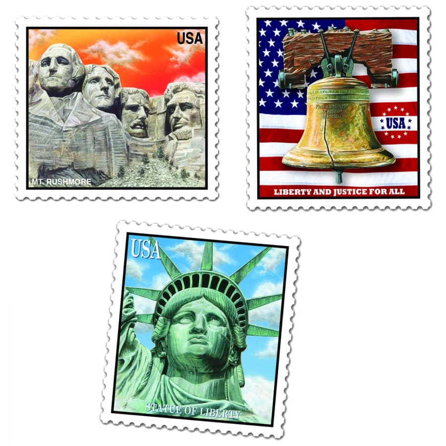 Timbres sur l'Amérique, vendus uniquement en set de 3. Les deux surfaces des timbres sont imprimées et mesurent 45 centimètres de hauteur sur 45 centimètres de largeur. Il est impossible pour vous de choisir ni le modèle ni la couleur lors de la commande. Vous recevrez un des set présentés. C'est un set de décoration idéal pour un anniversaire ou pour une fête nationale.