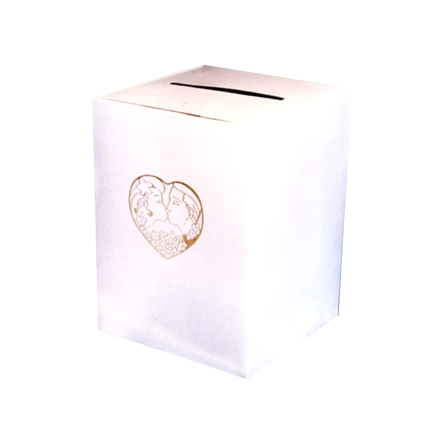 Tirelire spécialement pour mariés avec coeur imprimé au centre. La base de cet accessoire mesure 18 centimètres carrés sur une hauteur de 24 centimètres. Placez cette tirelire dans votre salle de réception et récoltez de quoi partir en lune de miel.